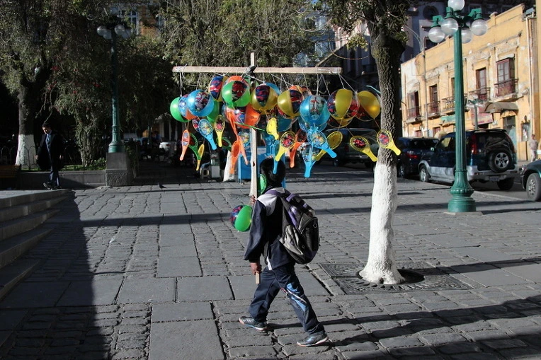 사람들이 축제를 즐기는 동안 이 아이는 풍선을 팔고 다닌다.