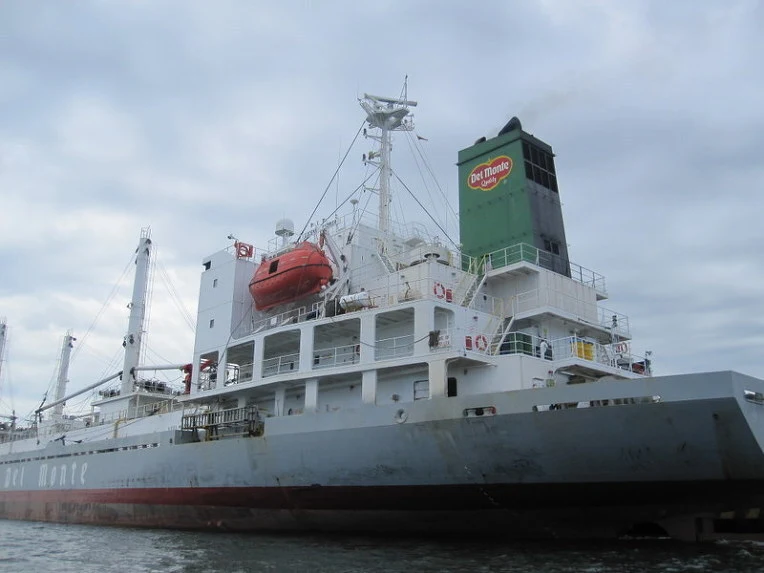 북아메리카로 바나나를 실어 나르는 델 몬테 배가 부두에 정착해 있다.
