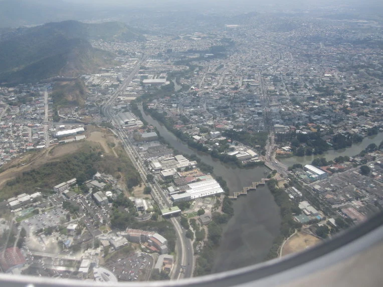 까다로운 절차를 마치고 비행기가 과야킬 상공을 난다.