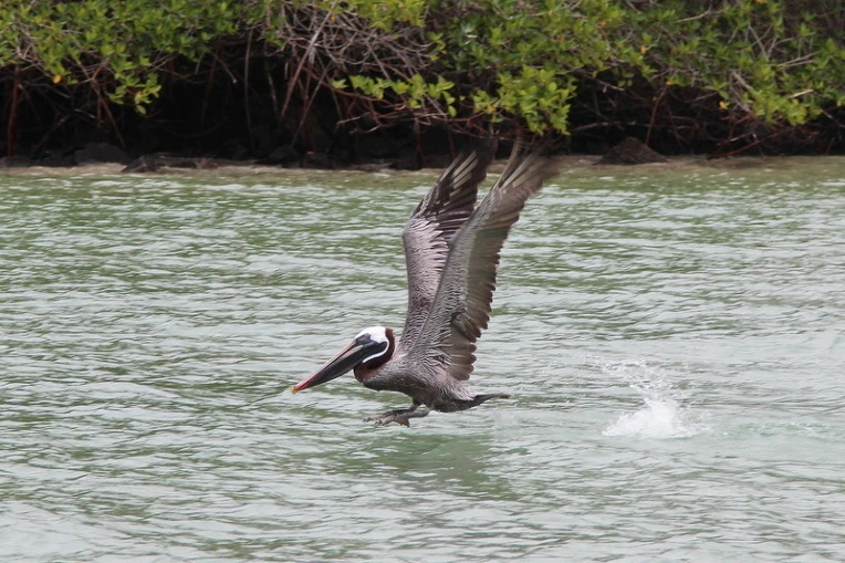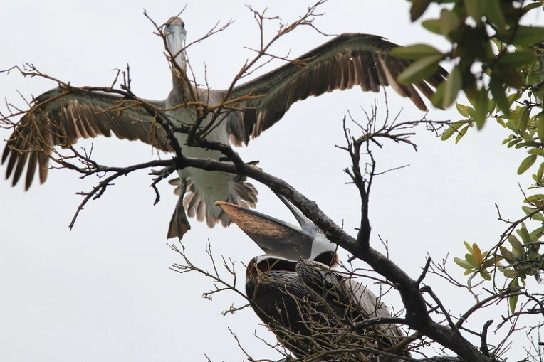 거센 파도 위의 맹그로브, 그 위에 앉은 펠리컨.