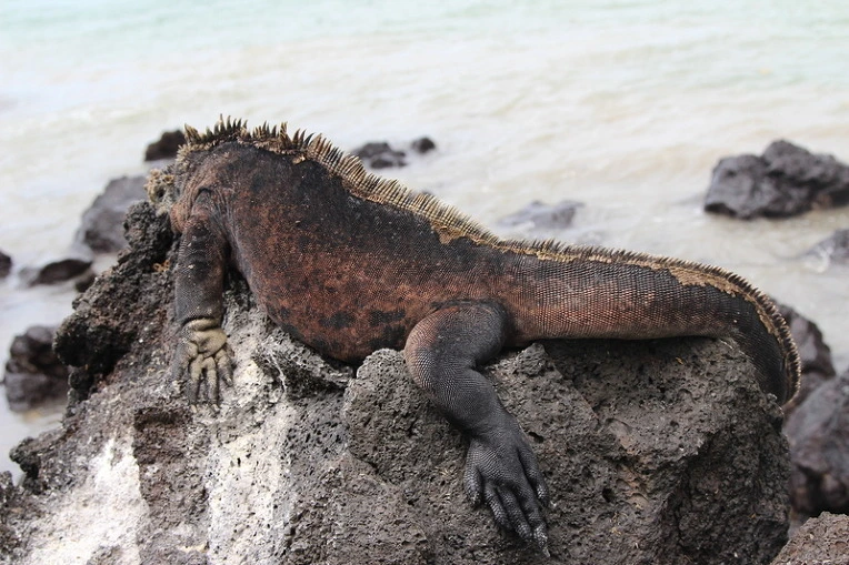 저처럼 생긴 바위 위에 누워 바위의 일부분이 된 듯한 바다 이구아나.