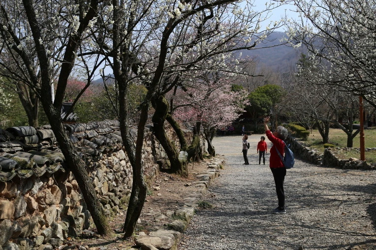 같이 온 친구가 돌담과 매화를 사진기에 담는다.