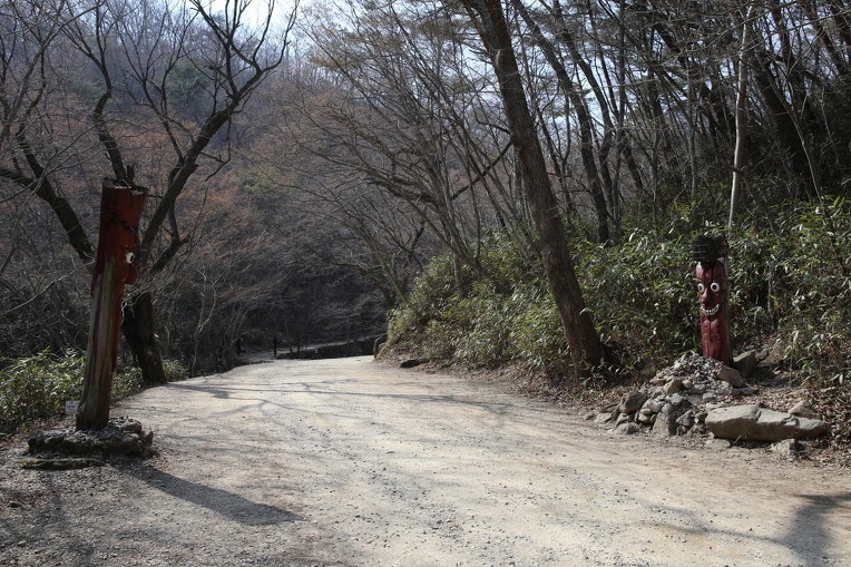 처음 눈에 들어온 것은 길 양옆에 서 있는 한쌍의 붉은색을 칠한 목장승이다,