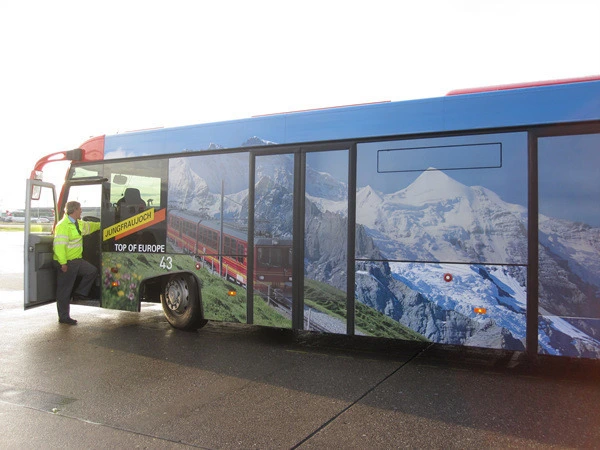 터미널 D에서 알프스와 에델바이스가 그려진 이렇게 화려한 버스를 타고 비행기를 타러 간다