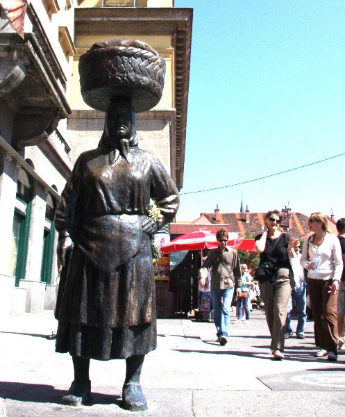 시장의 입구에 서 있는 돌라치의 상징인 바구니를 인 아줌마.
