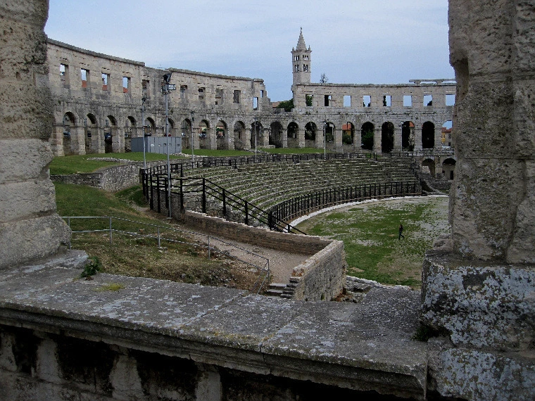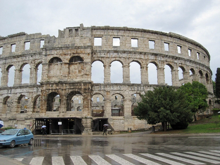 크로아티아 여행의 마지막 목표가 이스트라 반도의 끝에 위치한 풀라였었다 풀라에는 100만 년 전부터 사람이 살았던 흔적이 있고 기원전 177년에 로마가 쳐 들어와 로마제국의 속국이 되었다. 로마제국이 한창일 때는 10번째 도시가 될 만큼 번성해서 지금도 원형경기장을 비롯한 로마의 유적이 많이 남아있다. 항구가 내려다 보이는 곳에 1세기에 지은 아레나라고도 하고 암피티어터라고도 부르는 검투사 경기가 열렸던 원형경기장이 있다.