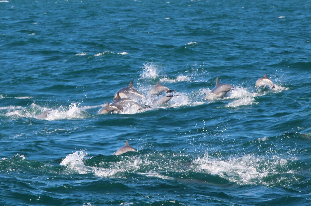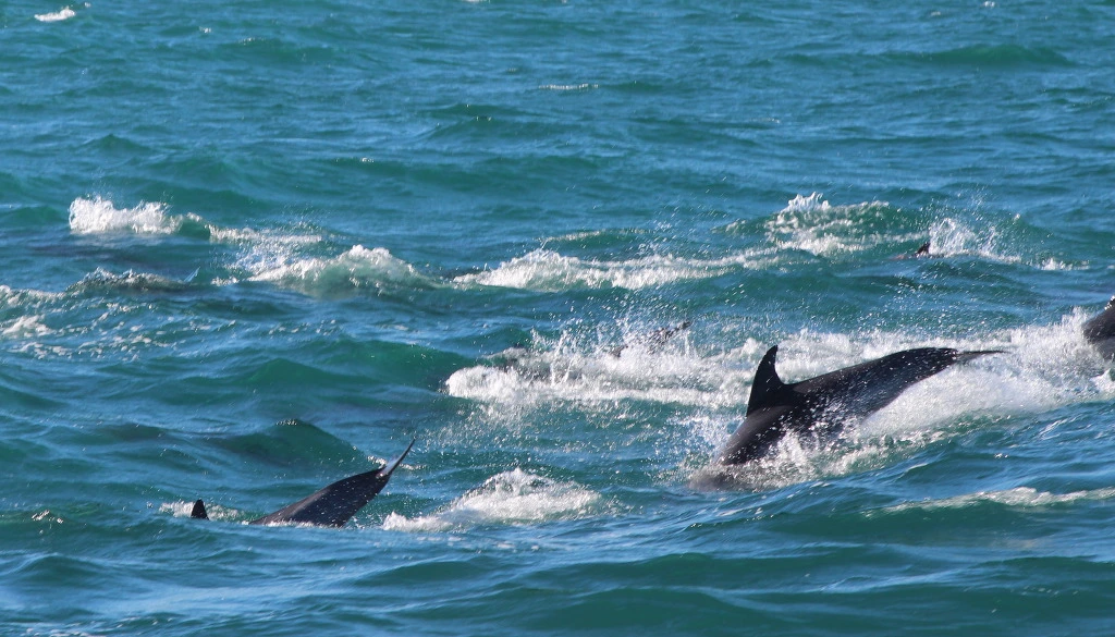 푸른 돌고래 떼가 우리가 탄 배를 따라오고 있었다.
