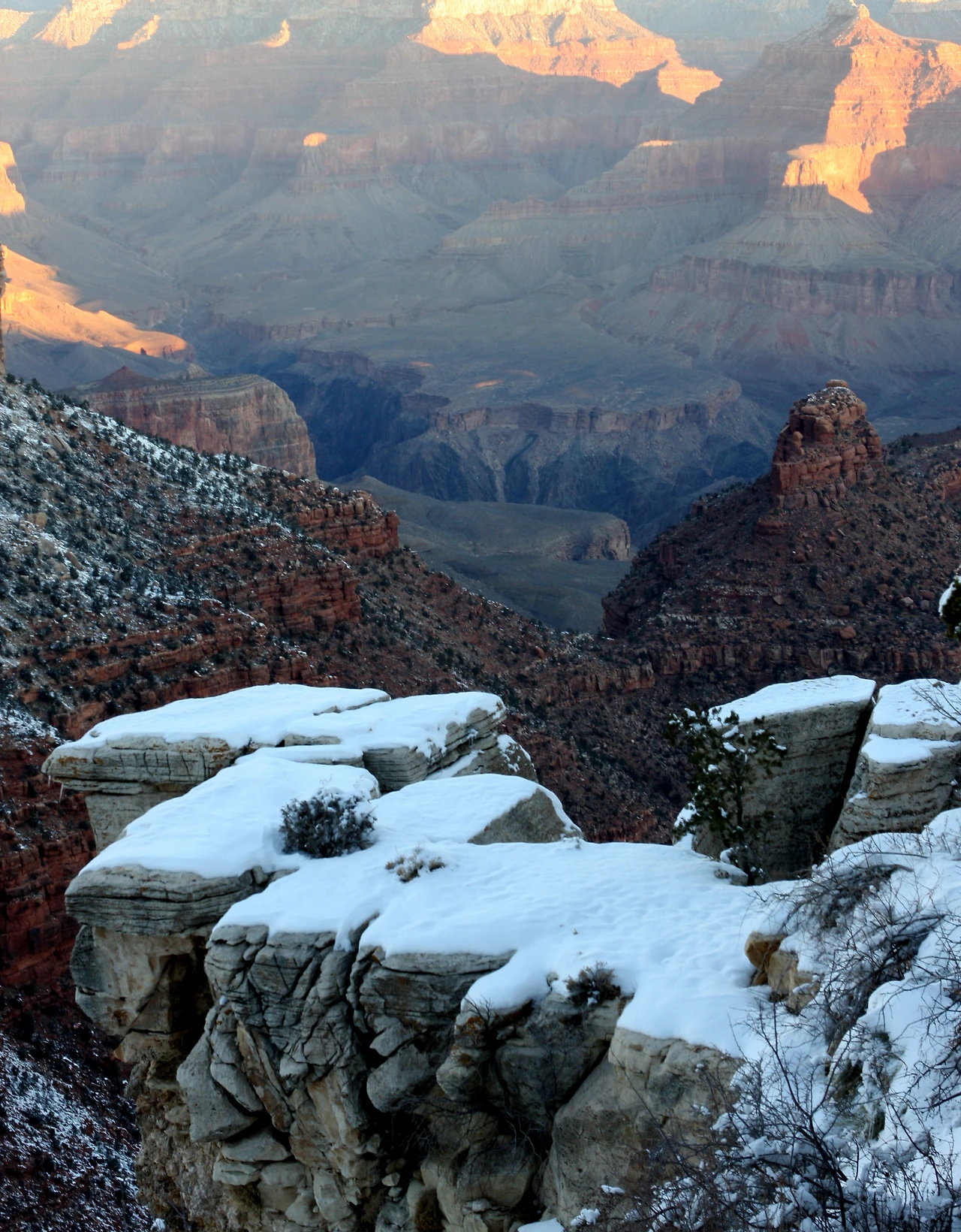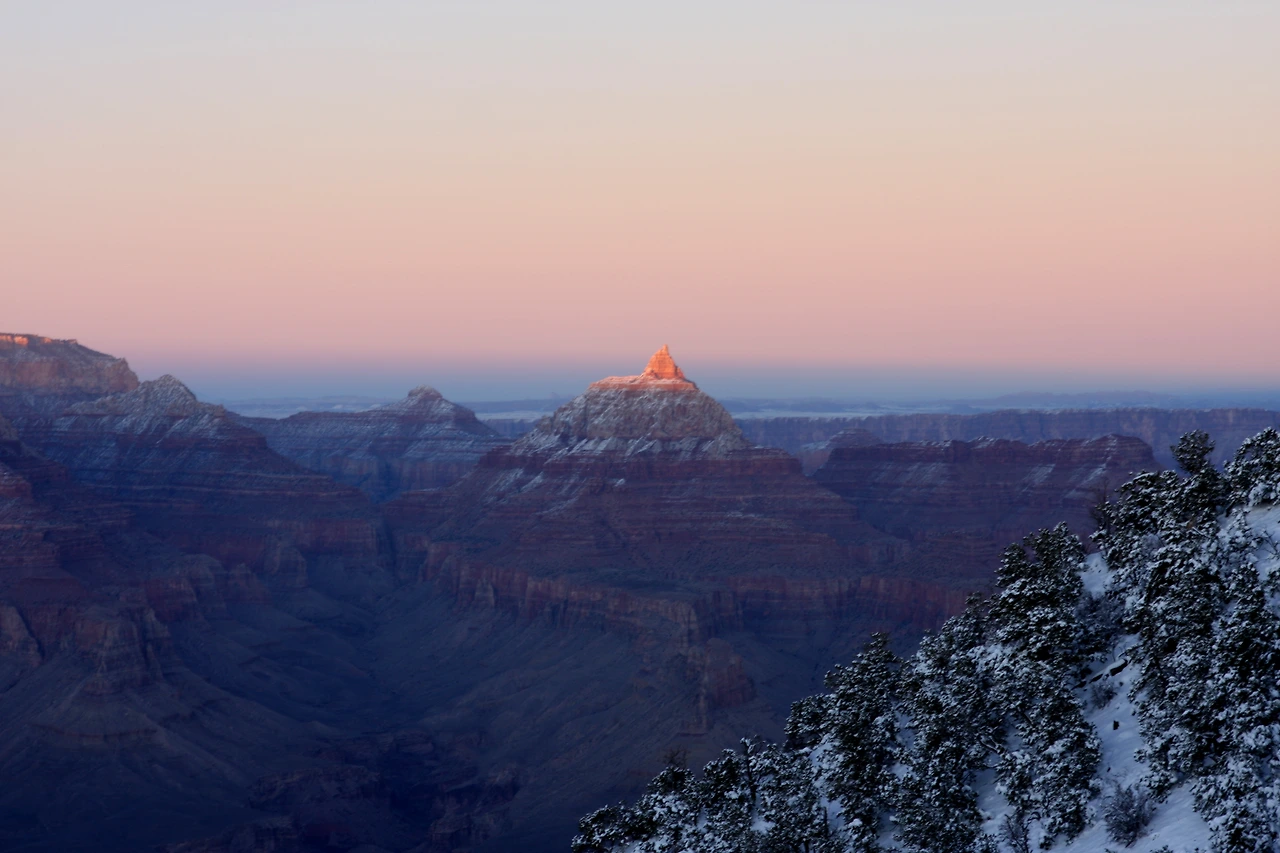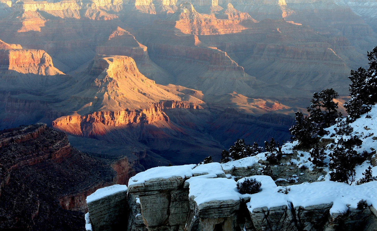 어느 추운 날, 그랜드캐년 사우스림을 갔다. 눈이 내린 후 영하 10도까지 내려가 체감온도는 그보다 훨씬 추웠으나 눈에 덮인 그랜드캐년은 추위마저도 고마워해야 할 만큼 아름다웠다. 계획을 하지 않아 숙소가 걱정이 되었는데 공원 입구에서 래인져에게 물어보니 공원 안 그랜드캐년 빌리지에 방이 있을 거라 하여 숙소 걱정 안 하고 느긋하게 그랜드 포인트에 들어가 해저 무는 협곡을 내려다보았다.