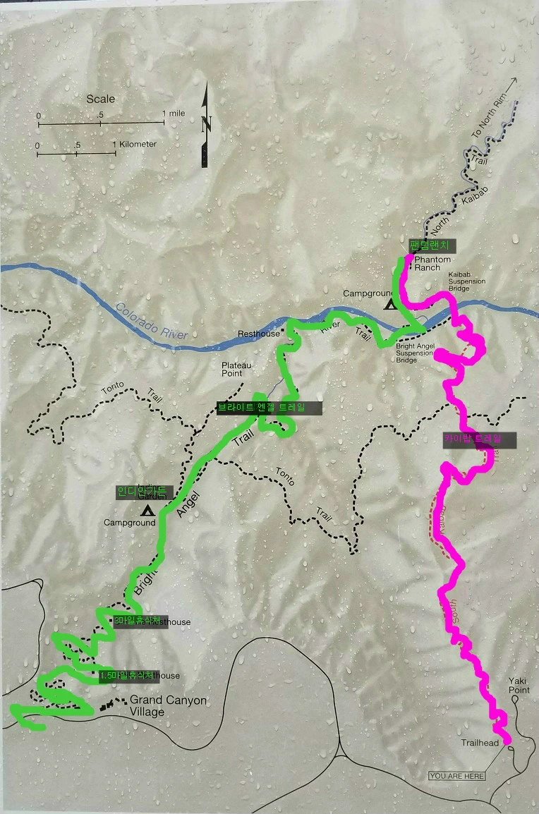 1500미터 아래까지 걸어 내려가야 한다. 카이밥 트레일은 경사가 급하고 물이 없다.