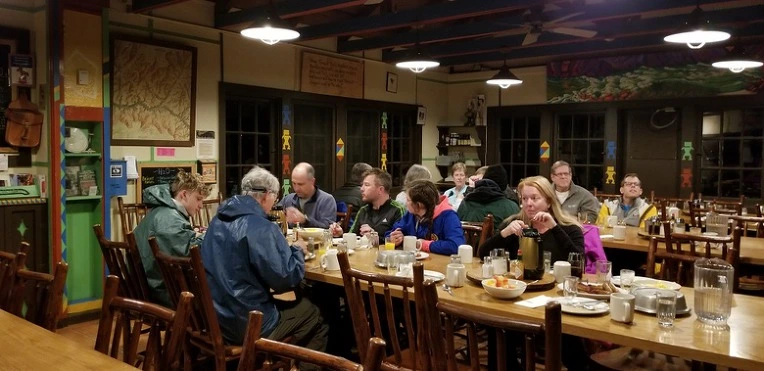식당으로 갔다. 문 앞에서 사람들이 기다린다. 음식을 다 차려놓은 후 문을 열어준다. 15개월 전 예약한 저녁식사가 나를 기다리고 있다. 메뉴는 스테이크와 감자 , 샐러드다. 노새 등에 실려 온 재료로 만들어 음식값은 좀 비싸지만 음식은 기대 이상으로 싱싱하고 맛있었다. 요리사가 따로 있는 건 아니고 국립공원 레인저들이 돌아가며 6주일씩 근무한다고 했다. 이번 근무자가 음식 솜씨가 좋은가보다.