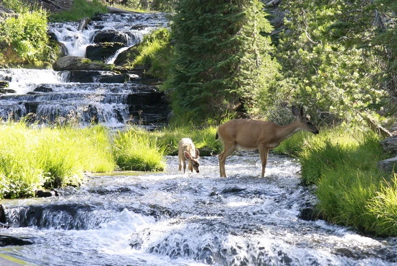 사슴은 새끼를 데리고 나와 물을 마신다.