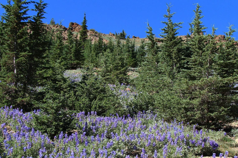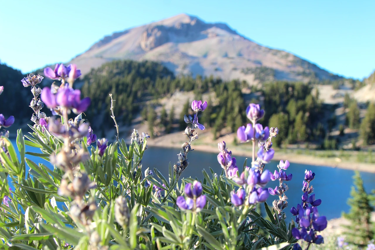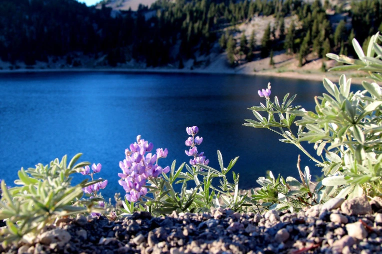 라센 피크 바로 아래 헬렌 호숫가에 핀 루파인.