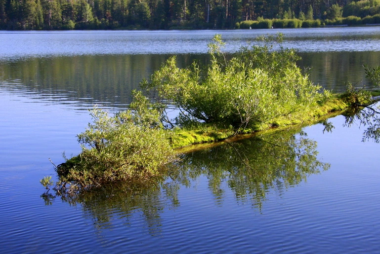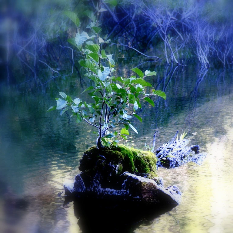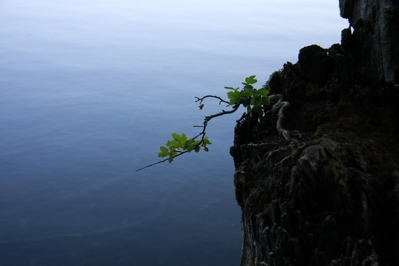 물속에 넘어져 죽은 나무에서 새 나무가 나와 자라고 있다.