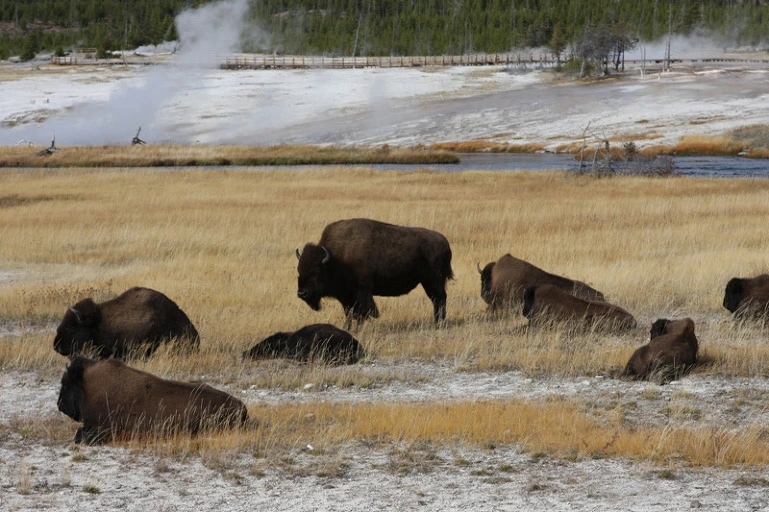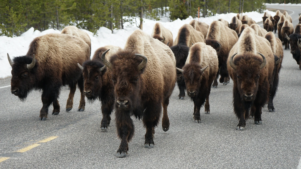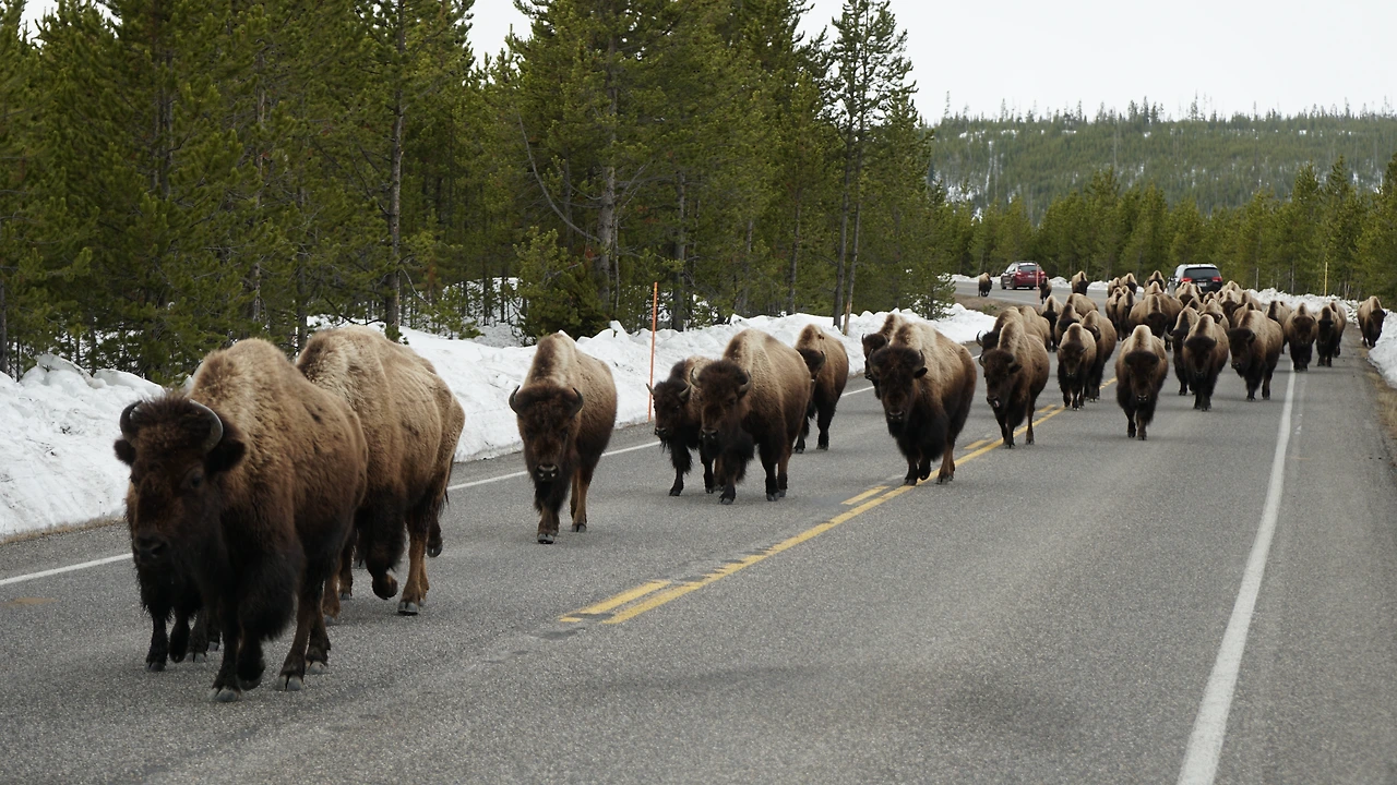 공원 문을 연 바로 다음 날인 4월 20일 들소들은 겨우네 마음대로 다니던 길을 떼지어 행진하고있었다. 갑자기 들이닦친 방문객들에게 못마땅한 표정으로 지나간다.