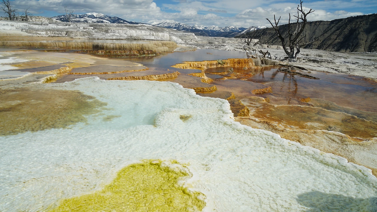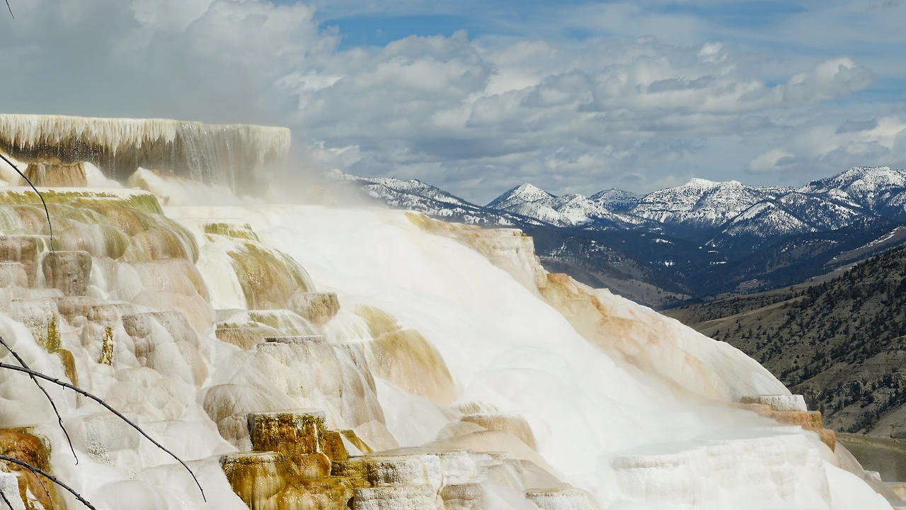 매머드 핫 프링(Mommoth Hot Spring)에서는 뜨거운 물이 쉴 새 없이 흘러내린다.