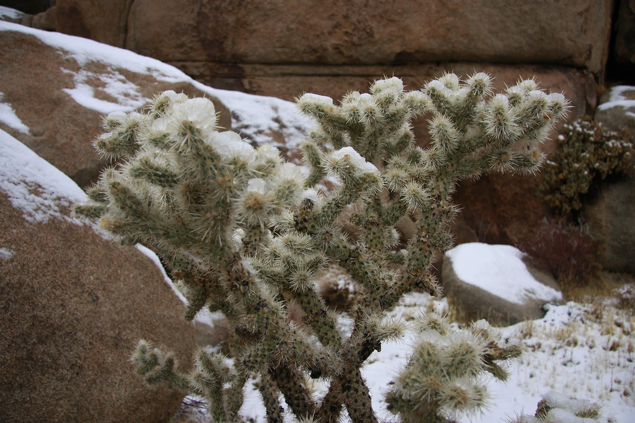 눈 맞고 얼어있는 테디베오쵸야(Teddy bear cholla). 일 년 중 대부분 화씨 100도가 넘는 사막기후인데