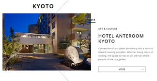 2011년에 교토에 위치한 기숙사를 호텔과 레지던스 복합시설로 개조하면서 호텔 안테룸 교토가 처음 문을 열었어요. 2020년에는 일본 오키나와의 안테룸 나하, 그리고 안테룸 서울이 문을 열었고요. 지역의 가치를 생각하는 안테룸 교토는 낙후된 동네에 예술과 문화 활동을 흥미로운 기획과 콘텐츠 스토리텔링으로 새로운 바람을 몰고 왔죠.