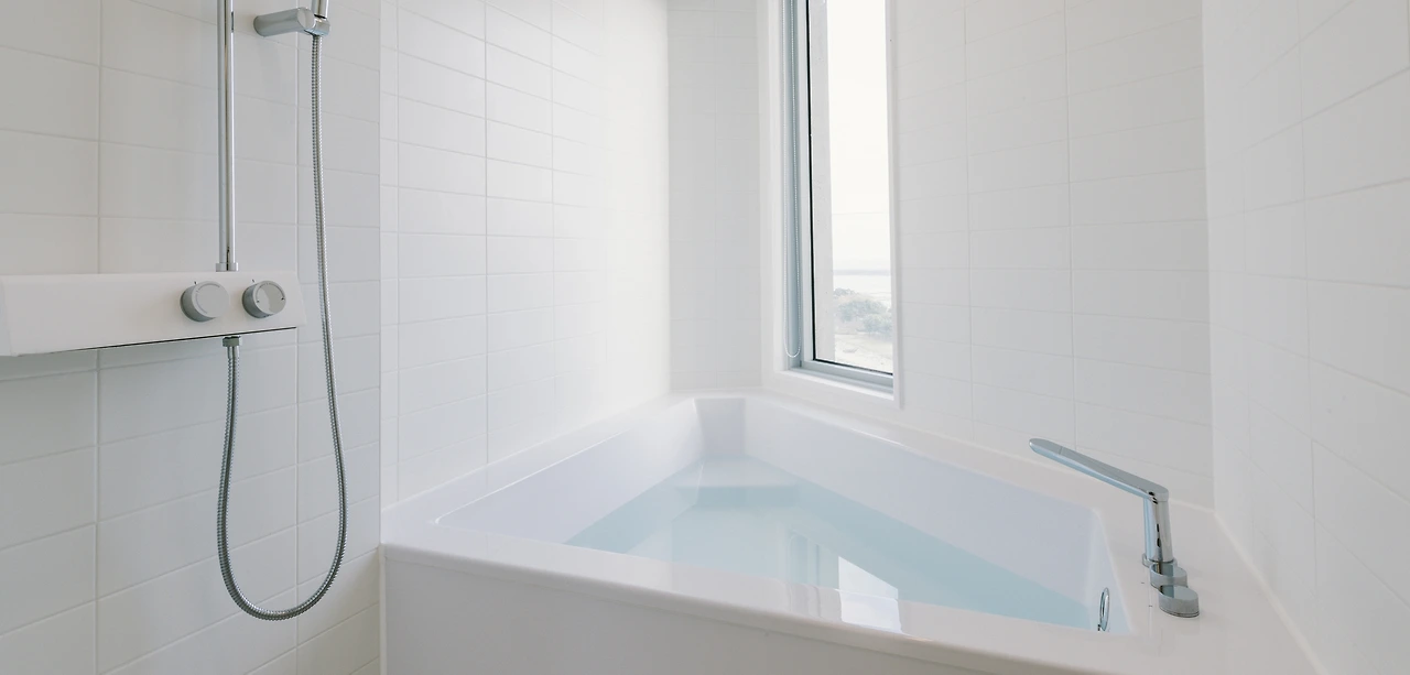 디럭스 객실의 매력 중 하나는 바다 전망이 있는 욕조랍니다. 바로 욕실로 안내해드리겠습니다. 샤워기 오른쪽에 이런 모양의 욕조가 있습니다. 작지만 창 너머로 바다 풍경이 보여서 목욕하는 시간이 지루하지 않답니다.