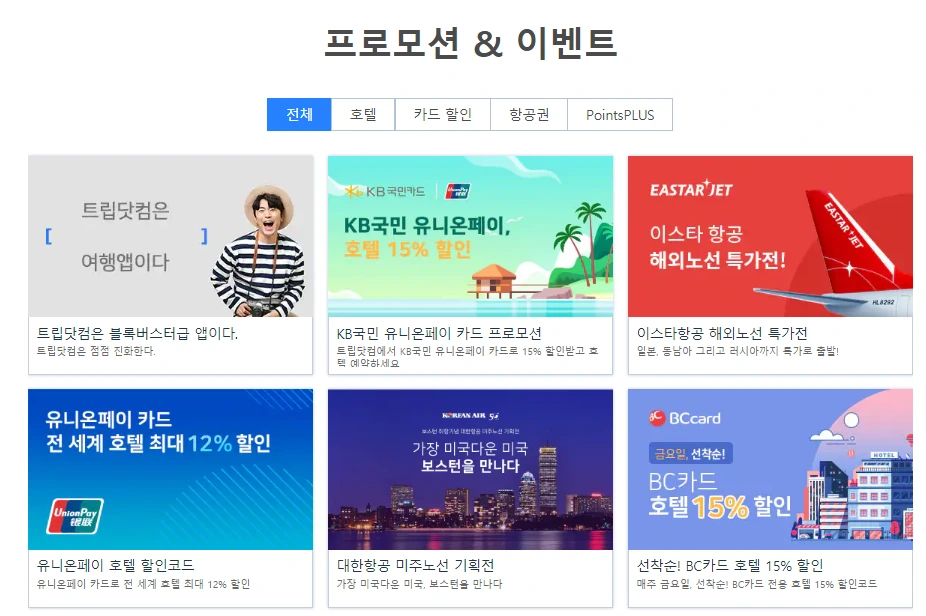 트립닷컴에서는 다채로운 프로모션으로 여행을 더욱 풍성하게 만들어 줄 예정입니다. 여행의 모든 것을 한 번에 준비할 수 있으며 특가에 할인을 더해 경제적인 여행을 완성할 수 있을 뿐 아니라 24시간 고객센터, 트래블 맵, 실시간 운항 조회, 전 세계 항공권 검색 등으로 언제든 편리하게 여행을 계획할 수 있는데요. 해외 수수료 없이 결제금액 그대로 청구되며 네이버 포인트 적립의 혜택까지 쏠쏠하게 챙겨가는 것도 잊지 마세요! 아래의 URL에서 유니온 페이 호텔 예약 프로모션과 이스타항공 해외 노선 특가전, 대한항공 미주노선 기획전, 이 주의 특가 호텔, 각종 신용카드 혜택 등 푸짐한 혜택을 만나볼 수 있습니다.