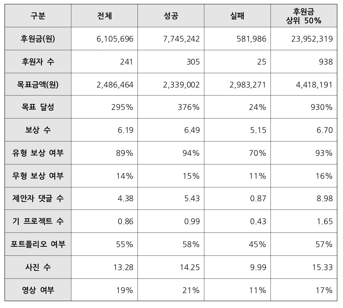 나는 2019년 카이스트 석사 학위 논문 ‘크라우드 펀딩을 활용한 출판 미래 전략 연구’에서 2018년 성공한 출판 크라우드 펀딩 프로젝트의 특성을 분석했다. 성공 프로젝트의 평균 후원액은 약 775만 원이었고, 후원자수는 305명이었다. 목표 금액은 약 234만 원이었으며, 보상의 패키지의 종류는 약 6.5개였다. 이미지 수는 14.3개, 제안자의 댓글 수는 5.4개였다.