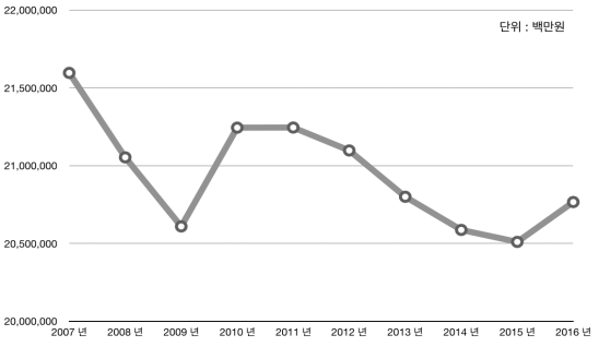출판 산업의 규모가 점점 줄고 있다. 통계청 출판산업총괄 자료에 따르면 2007년부터 2016년까지 우리나라 출판 산업 총매출액은 꾸준히 감소했다. 2007년에 21조 5955억 원이던 매출액이 2016년에는 20조 7658억 원으로 10년 사이 3.8% 감소했다.