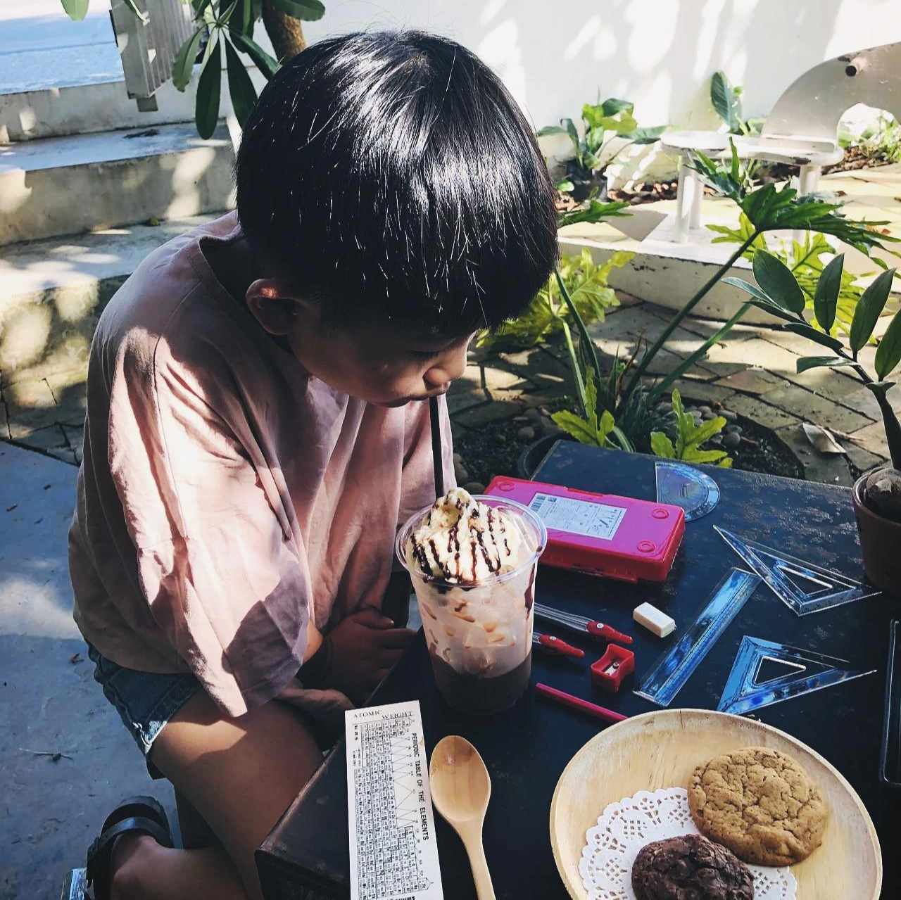 제이는 카페에 걸어오는 동안 들른 문구점에서 사 온 컴퍼스 세트를 보면서 기뻐했다. 자로 여기저기 측정하며 “컵은 8cm”라는 사실을 알려주었다.