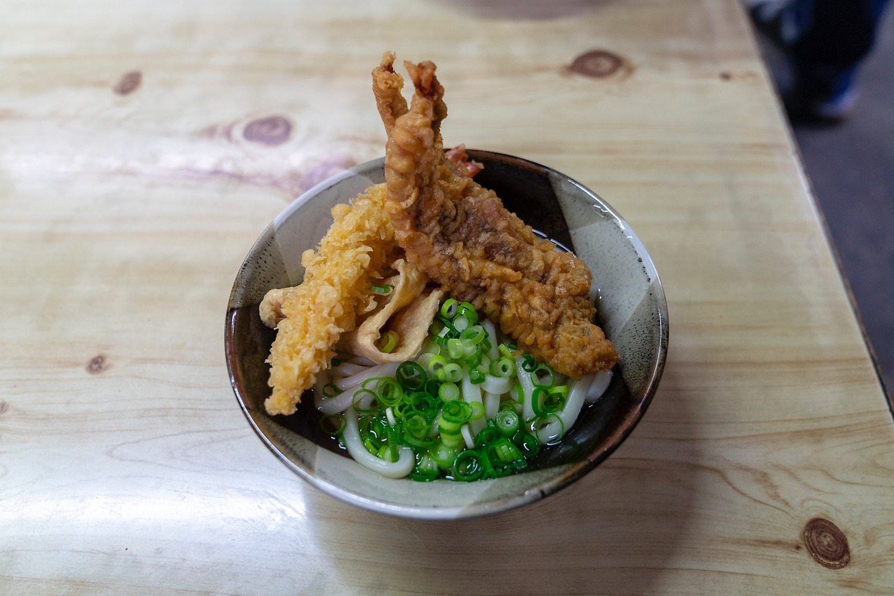주문한 우동을 받은 후에는 옆에 있는 튀김 코너에서 원하는 튀김과 유부를 골라 우동 위에 올리면 된다. 가장 인기 있는 튀김은 고로케와 새우 튀김이다. 보통 유부를 비롯해 2~3가지 튀김을 올려 먹는다. 원하는 튀김을 고른 뒤에는 원에게 우동 사발을 보여준 후 계산하면 된다. 가게 뒤쪽 구석에는 뜨거운 육수, 차가운 육수, 파가 준비되어 있다. 육수와 파를 더한 후 가게 안 또는 가게 밖에서 우동을 맛보면 된다. 가게 안이 매우 비좁기 때문에 대부분 손님들은 가게 밖 간이 의자나 벤치에 앉아 우동을 먹는다. 자리가 없을 경우에는 그냥 우동 그릇을 들고 서서 먹는 손님도 있다.
