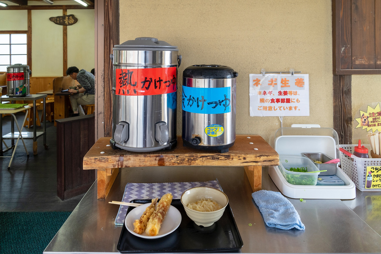 우동을 받았다면 옆에 있는 튀김 코너에서 원하는 튀김을 골라보자. 튀김은 기본 100엔이다. 계산을 한 후 우동과 튀김을 쟁반에 담아 밖으로 나가면 우동 육슈와 파, 간장, 젓가락이 준비되어 있다. 원하는 만큼 적당히 육수를 붓고, 파를 올린 다음 간장을 뿌린 다음 자리에 앉아 우동과 튀김을 맛보면 된다.