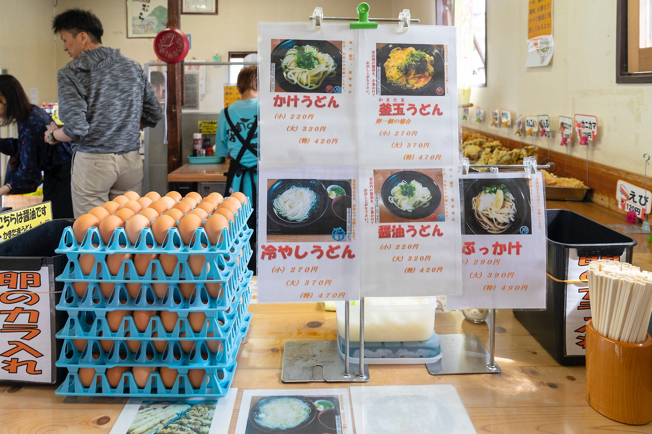 아침 일찍 찾아왔다고 생각했지만 역시 대기 줄이 늘어서 있다. 나카무라 우동집은 셀프 우동집으로 가장 기본 우동인 가케 우동(かけうどん, 220엔), 차가운 우동인 츠메타이 우동(冷たいうどん, 270엔), 날계란을 비벼먹는 가마타마 우동(釜たまうどん, 270엔)이 유명하다. 가게 안으로 들어서면 직원에게 원하는 우동을 말하면 된다. 가마타마 우동을 주문한 경우 우동 그릇에 날계란을 먼저 풀어 넣어야 한다. 젓가락을 이용해 계란을 먼저 풀고 나면 그 위에 뜨거운 우동 면을 올려준다. 뜨거운 가마솥에서 건져 올린 우동 면을 바로 넣어주기 때문에 우동 면의 열기에 계란이 살짝 익는다.