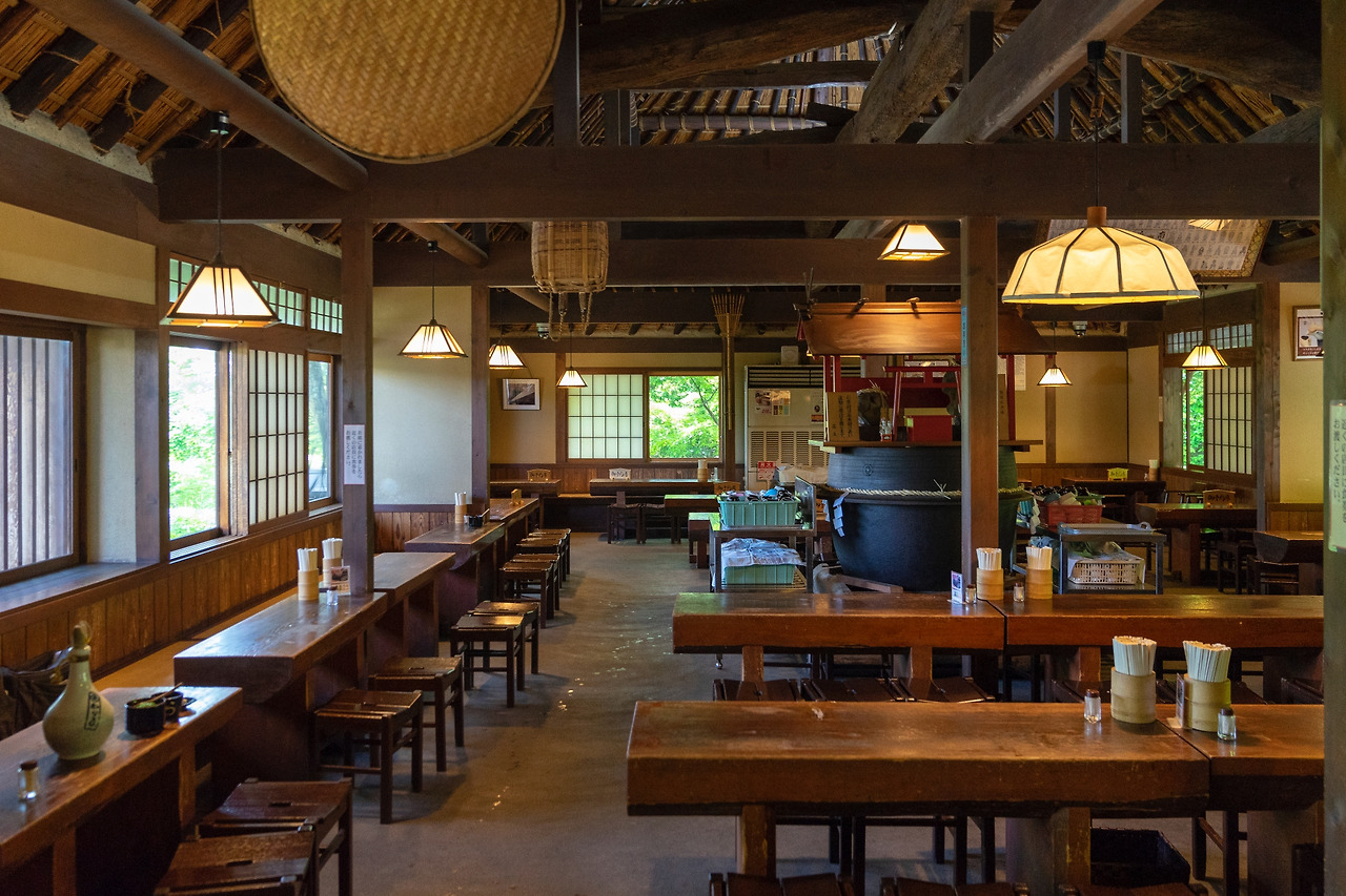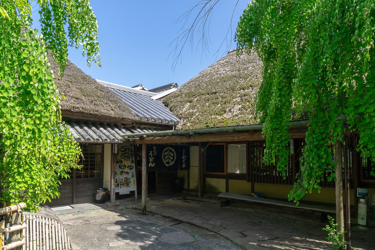 주차장에서 기념품 상점 옆 작은 돌계단 길을 따라 내려가면 밀짚을 쌓아 초가지붕을 올린 와라야가 보인다. 와라야 앞에는 고즈넉한 정원이 꾸며져 있는데, 산에서 내려온 물줄기로 물레방아가 시원스럽게 돌아가고 있다. 와라야 안으로 들어가면 넓은 공간에 커다란 나무 테이블이 빼곡히 놓여져 있는 걸 볼 수 있다. 고민가 특유의 옛스러움이 느껴지며, 밀짚을 쌓아올린 천장도 바라볼 수 있다.