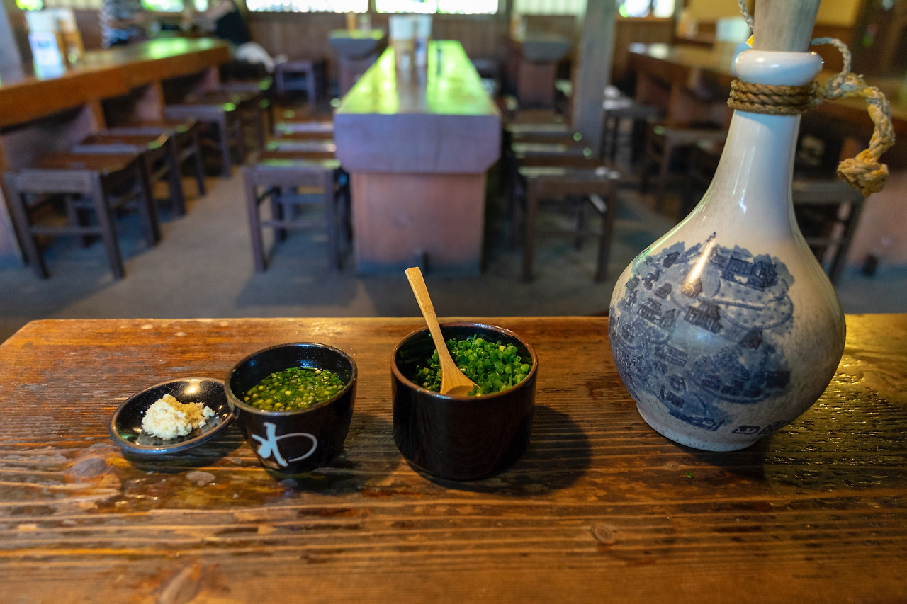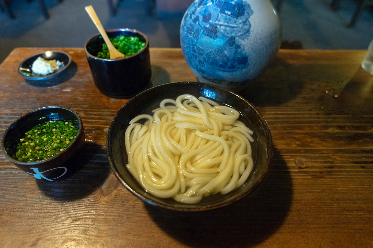 와라야에서는 일반 식당처럼 직원에게 원하는 메뉴를 주문하면 된다. 가장 인기 있는 메뉴는 삶은 우동 면과 육수를 함께 그릇에 담아 쓰유에 찍어 먹는 가마아게 우동(釜あげうどん)이다. 사람 숫자에 따라 크기를 선택할 수 있는데, 가장 작은 1인용 보통(並, 460엔)과 점보(ジャンボ, 700엔) 그리고 2인용 특대(特大, 930엔)가 있고 4~5인용 가족 우동(家族うどん, 2,370엔)이 있다. 가족 우동의 경우 테이블을 꽉 채울만큼 커다란 나무통에 우동이 잔뜩 담겨져 나오는데, 옛 시골 사람들이 나눠 먹었을 법한 모습 그대로다. 가마아게 우동을 찍어 먹는 쓰유는 호리병에 담겨져 있는데, 호리병 마개 손잡이를 잡고 쓰유를 그릇에 붓고, 파와 생강을 넣어 양념장을 만들면 된다. 와라야의 우동은 사누키 우동 특유의 쫄깃함과 매끈함이 잘 살아 있어 계속 음미하면서 먹게 된다. 시골스러운 가게 분위기도 마음에 들고, 여럿이서 온다면 다함께 나눠 먹을 수 있어 더 즐겁다. 우동을 다 먹고 난 뒤에는 바로 앞에 있는 시코쿠무라도 방문해보자.