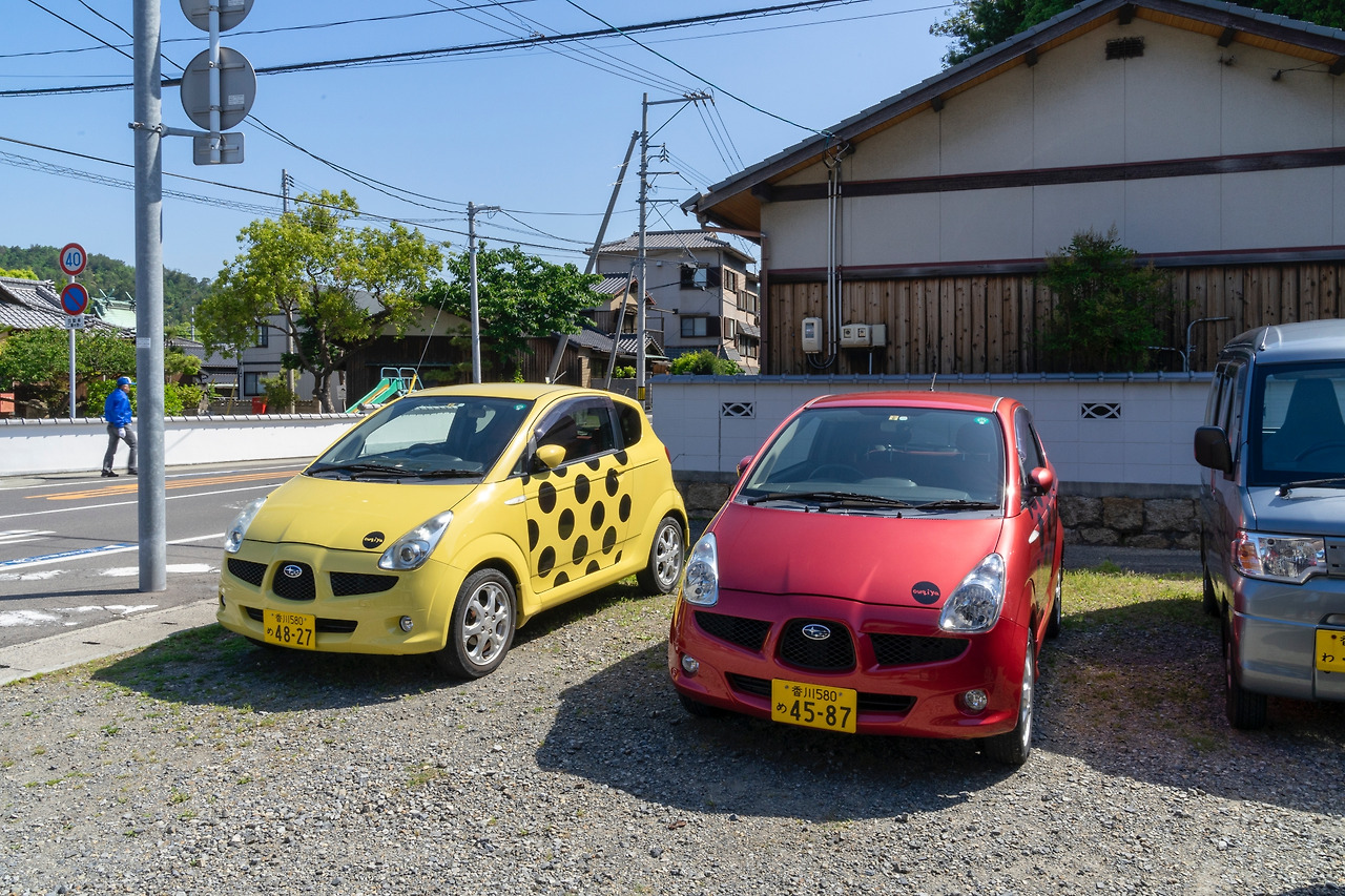 비가 오는 날이나 추운 겨울 또는 더운 여름에는 렌터카로 돌아다니는 게 좋다. 페리에 차를 싣는 과정도 간편하기 때문에 이용하는데 어려움은 없다. 또한 오카야마 우노 항에서 출발해 나오시마를 여행하고 다시 다카마쓰행 페리에 차를 싣고 다카마쓰로 가는 일정 및 그 반대 일정도 가능하기 때문에 일정도 고려해서 어떻게 움직일지 정하면 좋다.