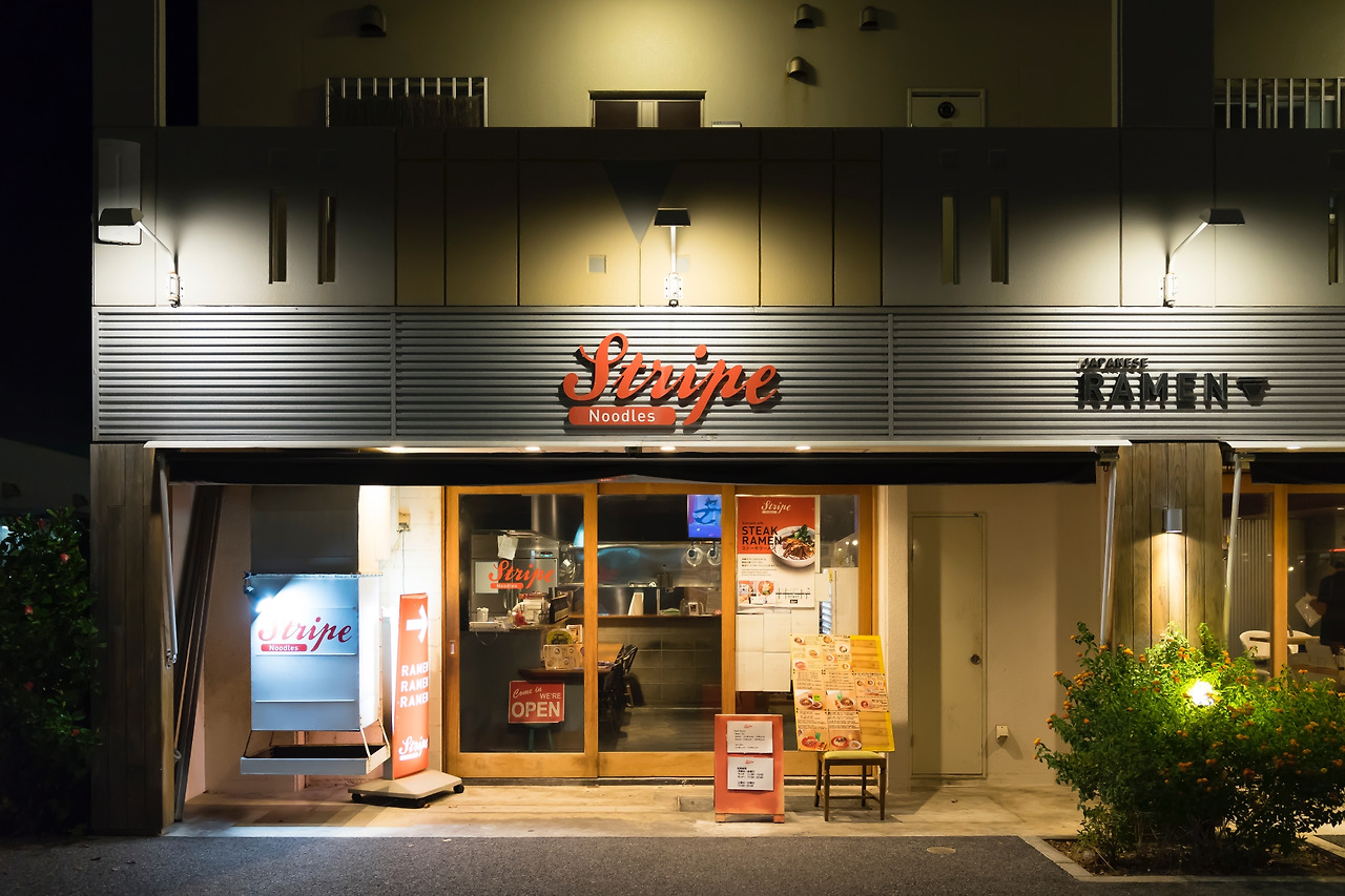 아메리칸 빌리지 앞에 두툼한 스테이크가 올라간 라멘을 선보이는 스트라이프 누들즈가 위치해 있다. 2013년 문을 연 라멘집으로 도쿄의 인기 라멘집 소라노이로 (ソラノイロ)의 주인장이 함께 참여해 만들었다. 오키나와만의 문화를 담은 라멘을 고심하다 미국식 문화가 강한 오키나와의 특성을 살린 스테이크 라멘을 개발하게 되었다고 한다. 가게 외관은 라멘집이라기 보다 세련된 칵테일 바 같은 모습. 가게 입구에 있는 자판기에서 원하는 메뉴를 선택하고 돈을 넣으면 된다.