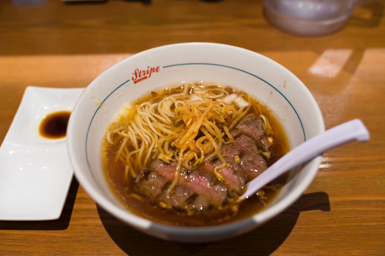 스트라이프 누들즈에는 스테이크 라멘 외에도 소금으로 맛을 낸 시오 라멘 (塩らーめん, 750엔)과 토마토 퓨레를 더한 토마토베지 소바(トマトベジソバ, 850엔)도 있다. 스테이크 라멘은 총 세 종류가 있는데, 간장을 넣은 일반 스테이크 라멘 (ステーキラーメン, 980엔), 소금을 넣은 스테이크 라멘 시오(ステーキラーメン塩, 980엔), 매운 고추기름이 들어간 스테이크 라멘 레드(ステーキラーメンRED, 1,150엔)가 있다. 스테이크 라멘은 사골과 닭 뼈 그리고 가다랑어, 멸치, 다시다 등을 넣고 우린 국물에 꼬들꼬들한 면을 넣고 그릴에 잘 구운 두툼한 스테이크를 먹기 좋게 잘라 올려 낸다. 스테이크에서 흘러나온 육즙이 라멘 국물을 더 감칠맛 있게 한다. 테이블에 준비된 A1소스를 더해 먹으면 스테이크 맛을 제대로 느낄 수 있다. 독특한 오키나와만의 라멘를 찾고 있다면 이곳을 추천한다.