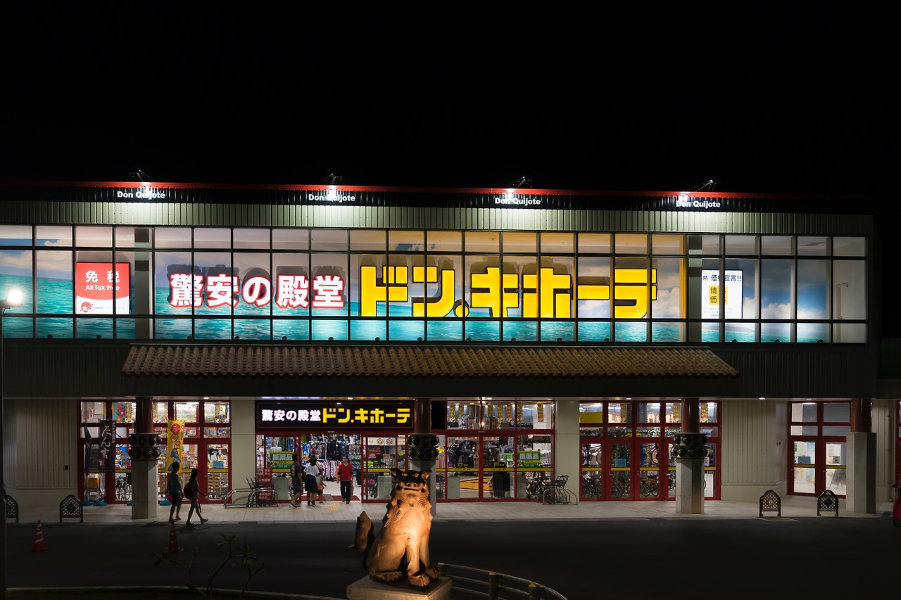 2016년 8월 11일 문을 열자마자 미야코지마의 쇼핑 중심지가 된 돈키호테. 식료품부터 생필품, 화장품, 약품, 잡화 등 거의 모든 제품을 구할 수 있는 종합 할인 매장이다. 일본 여행을 몇 번 다녀본 여행자라면 돈키호테는 빠질 수 없는 쇼핑지로 통한다. 메가 돈키호테 미야코지마점 앞에는 돈키호테의 마스코트인 돈펜( ドンペン )이 서있고, 그 뒤로 오키나와의 마스코트 시사가 눈에 들어온다.