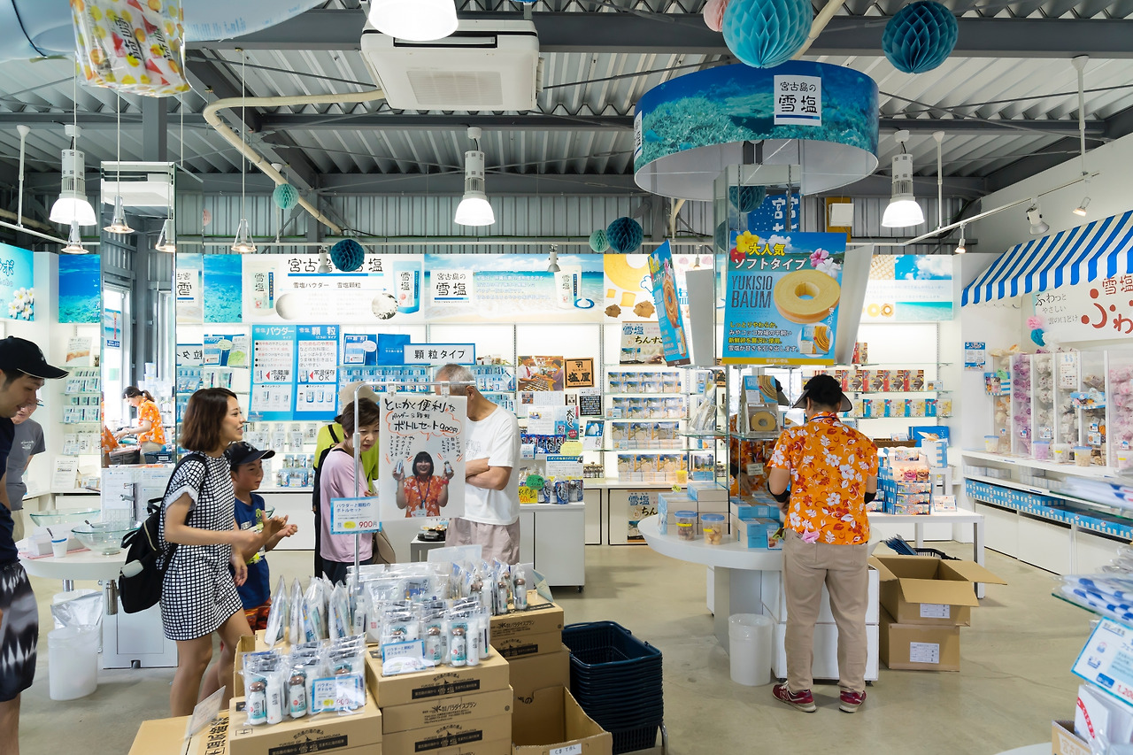 한 시간이면 섬 한 바퀴를 돌 수 있을 정도로 작은 섬 미야코지마에는 대형 쇼핑몰부터 돈키호테, 지역 특산물 판매점 등 다채로운 쇼핑 장소들이 있다. 여행 중에 필요한 생필품이나 해수욕에 필요한 용품들은 맥스벨류, 돈키호테에서 구매할 수 있다. 선물용으로 사갈 기념품을 찾는다면 시마노에키 미야코와 유키시오 제염소를 찾아보자. 미야코지마 대표 특산품인 망고를 비롯해 미야코지마 앞 바다에서 끌어올린 바닷물로 만든 소금을 구할 수 있다.