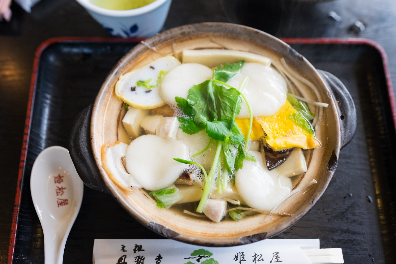 시마바라의 대표 향토 음식인 구조니 (具雑煮)를 맛볼 수 있는 곳으로 시마바라 성 바로 앞에 있다. 시마바라 성과 주변 관광지를 구경하고 찾아보자. 구조니라는 음식은 1637년 시마바라 난을 겪으며 탄생했다. 시마바라 난 당시 봉기군은 군량을 쌀이 아닌 떡의 형태로 저장해 먹었는데, 육수에 떡과 여러 채소를 함께 넣고 끓여 먹었다고 전해진다. 시마바라 난에 참여한 봉기군은 모두 몰살되었지만, 항쟁을 하며 먹었던 음식은 이렇게 후세에 전해졌다. 1813년 히메마츠야의 창업자가 처음 구조니를 내놓았다고 알려져 있으며 이제는 시마바라에 오면 꼭 먹어봐야 할 음식으로 소문나 있다.
