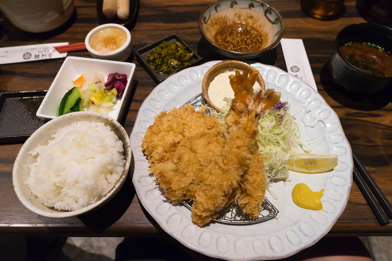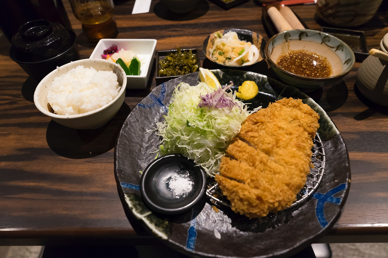 그 밖에 가츠동(かつ重, 1,674엔), 큼직한 새우를 튀겨 내는 에비 후라이 정식 (海老フライ膳, 1,533엔), 어린이 세트 메뉴도 준비되어 있다. 돈가스는 등심 부위로 요리하는 것이 정석이니, 이곳에서는 로스가츠(ロースかつ)를 주문해보았다. 돈가스를 주문하면 참깨가 담긴 작은 사발과 절구를 가져다준다. 기다리는 동안 참깨를 곱게 갈면서 돈가스 소스를 만들자. 참깨에 넣는 소스는 일본식 소스(和風)와 서양식 소스(洋風)로 나뉘는데, 둘 모두 돈가스와 잘 어울린다.