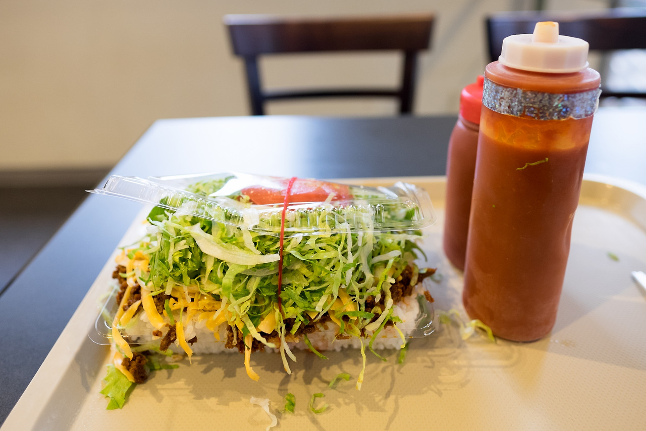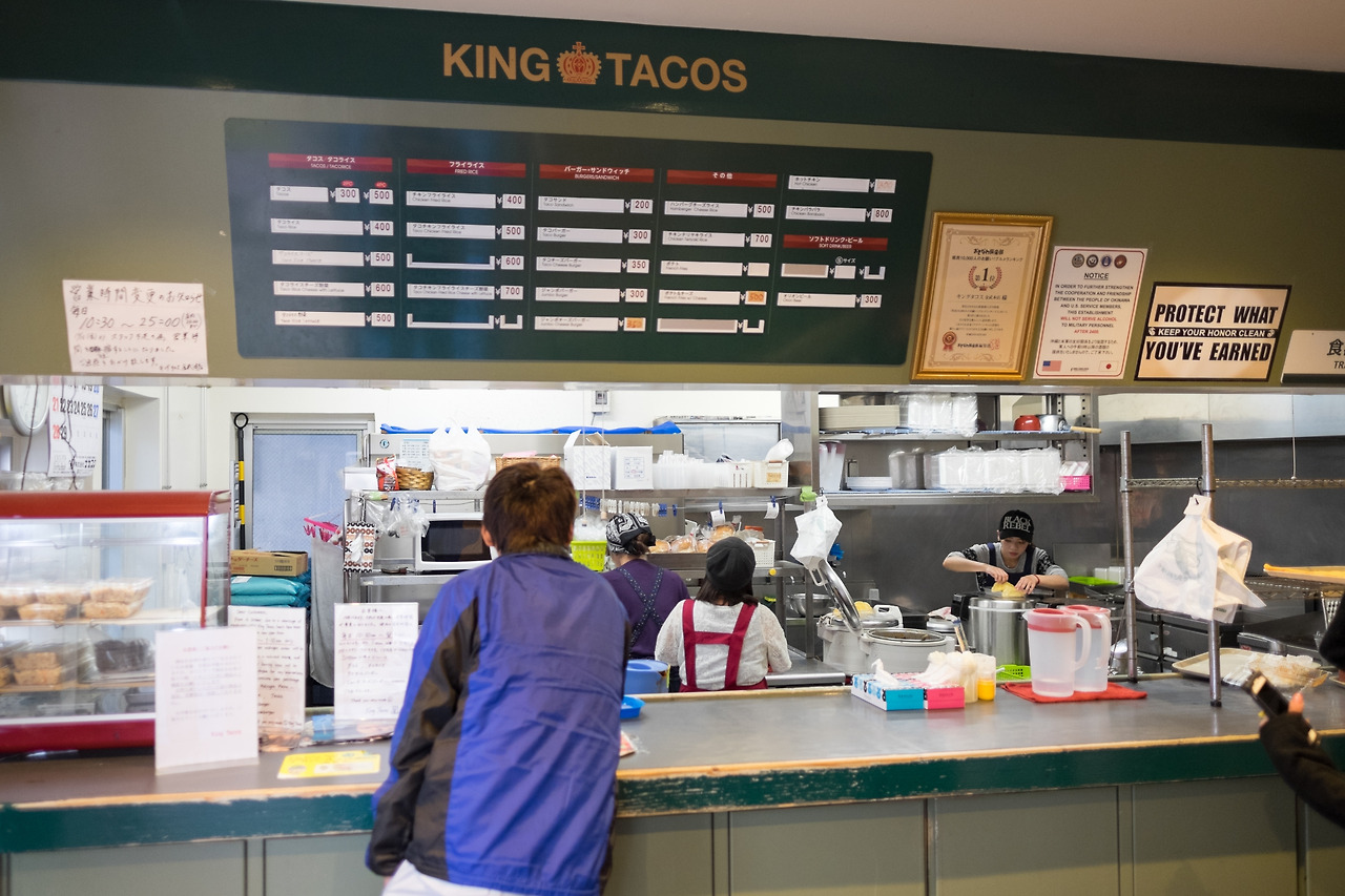 핑크색 가게 벽면에는 왕관을 쓴 귀여운 캐릭터가 그려져 있고, 그 아래 ‘TACO RICE’가 큼지막하게 적혀져 있다. 원조 타코 라이스 맛을 지켜온 가게답게 주말이면 긴 줄이 늘어선다. 인기 메뉴는 단연 타코 라이스로 치즈와 양상추를 올린 타코 라이스 (600엔)를 가장 많이 주문한다. 투명한 도시락통 안에 타코 라이스를 담아주는데, 통이 가득 차서 넘칠 정도로 많은 양. 웬만하면 두 명이서 같이 나눠 먹는 게 좋다. 매콤한 살사 소스를 취향에 맞춰 뿌려 먹자. 타코 라이스 외에 일반 타코(2개, 300엔) 및 타코 샌드위치(200엔), 타코 버거 (300엔) 등 타코를 이용한 다양한 요리가 준비되어 있다. 가게 2층에 40명 정도 앉을 수 있는 테이블이 갖춰져 있으며, 만약 테이블 자리가 부족할 경우 포장해서 근처 액티브 파크(アクティブパーク) 내 벤치에서 먹어도 된다.