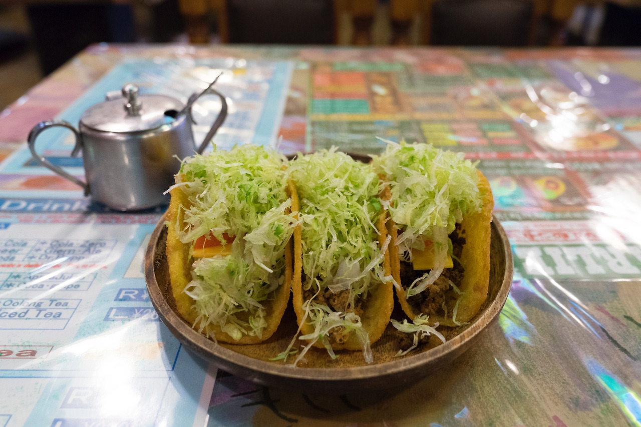 1인분은 500엔으로 타코 4개가 나온다. 음료는 계산대 옆에 냉장고가 있는데, 직접 꺼내와 계산대에서 계산하면 된다. 잠시 뒤 갓 튀겨낸 타코 네 개가 큰 접시에 담겨 나온다. 옥수수 토르티야에 고기, 양상추, 토마토가 올라간 매우 심플한 형태로 직접 만든 수제 살사 소스를 살짝 뿌려 먹으면 된다. 타코의 맛은 옥수수 토르티야의 고소함과 양상추와 토마토의 상큼함 그리고 살사 소스의 매콤함이 한데 어우러져 기분 좋은 맛을 낸다.
