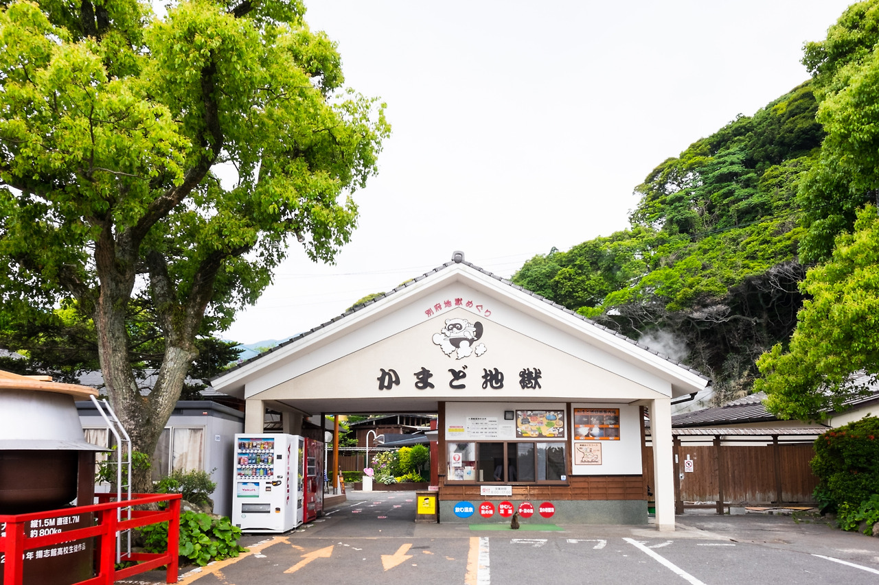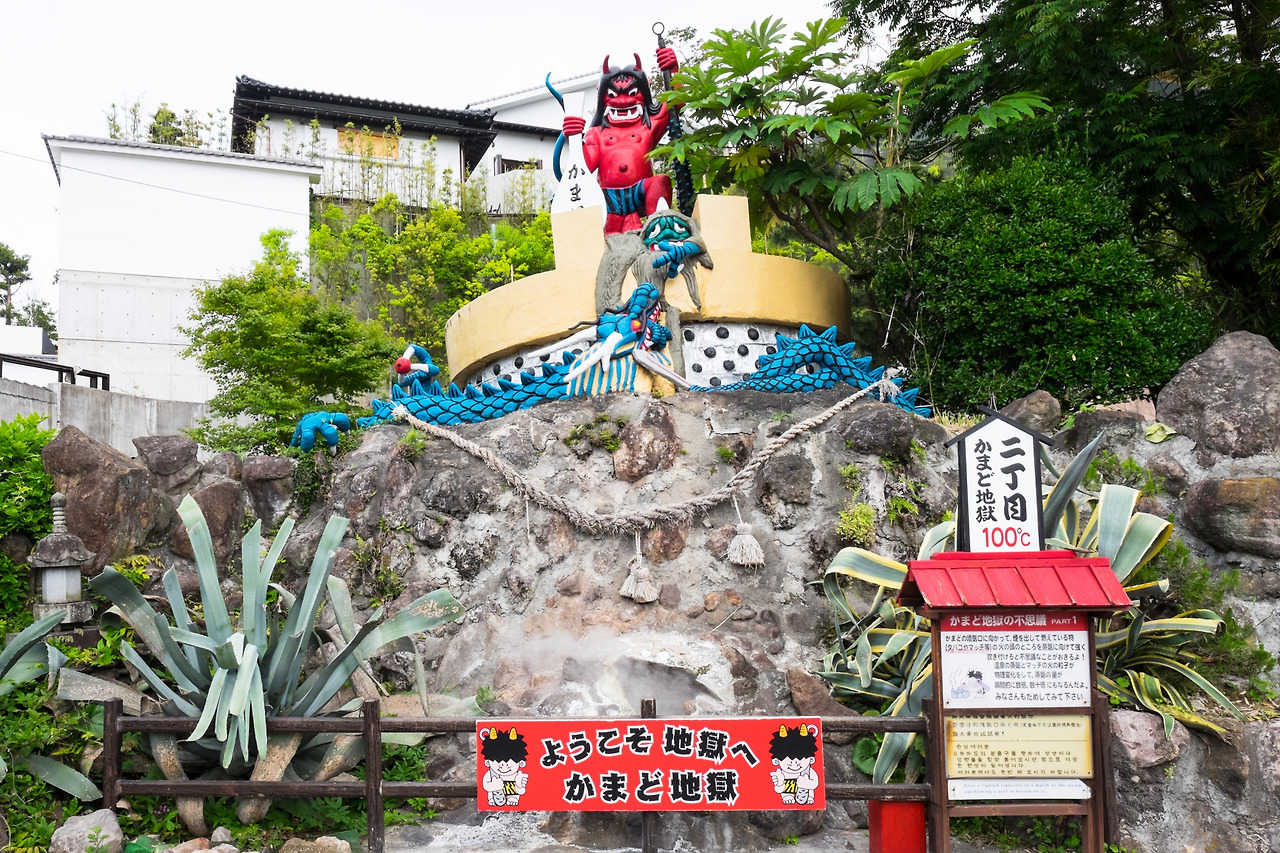 우리말로 ‘가마솥 지옥’ 또는 ‘부뚜막 지옥’으로 불리는 카마도 지옥. 과거 카마도 하치만구(竃門八幡宮)의 축제와 제사 때 이곳에서 솟아나는 뜨거운 증기로 밥을 지었다고 해서 이러한 이름이 붙었다. 입구에는 그 유래를 상징하듯 커다란 가마솥이 놓여 있다. 입구를 지나 안으로 들어서면 검은 도깨비 방망이를 들고 서있는 붉은 도깨비 동상이 보인다. 마치 지옥문을 지키고 있는 것 같아 오싹하다.