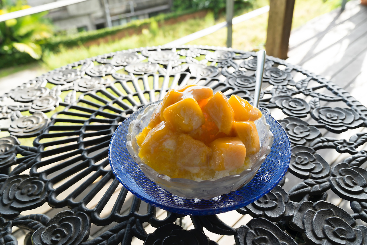 나하 슈리성 아래 긴조초 이시다타미 길 중간에 위치한 마다마 카페. 귀여운 고양이 동상이 반겨주는 마다마 카페에서는 시원한 망고 빙수(マンゴーかき氷, 750엔)를 판매하고 있다. 곱게 간 얼음 위에 큼지막한 망고가 듬뿍 올라가 있다. 망고 위에는 달달한 망고 시럽이 있어 단 맛을 한껏 끌어올려준다.