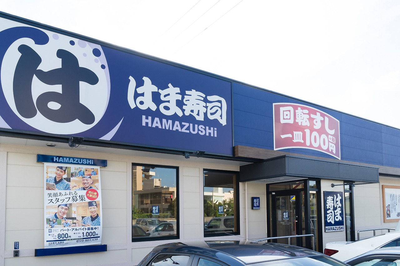 하마스시는 스시로, 무텐 쿠라스시와 더불어 일본 3대 회전초밥집으로 불린다. 2018년 8월 기준으로 일본 전역에 495개의 매장을 운영 중이며, 오키나와에는 8개의 점포가 있다. 구글 지도에 ‘hamazushi’를 검색하면 하마스시의 위치가 표시된다.