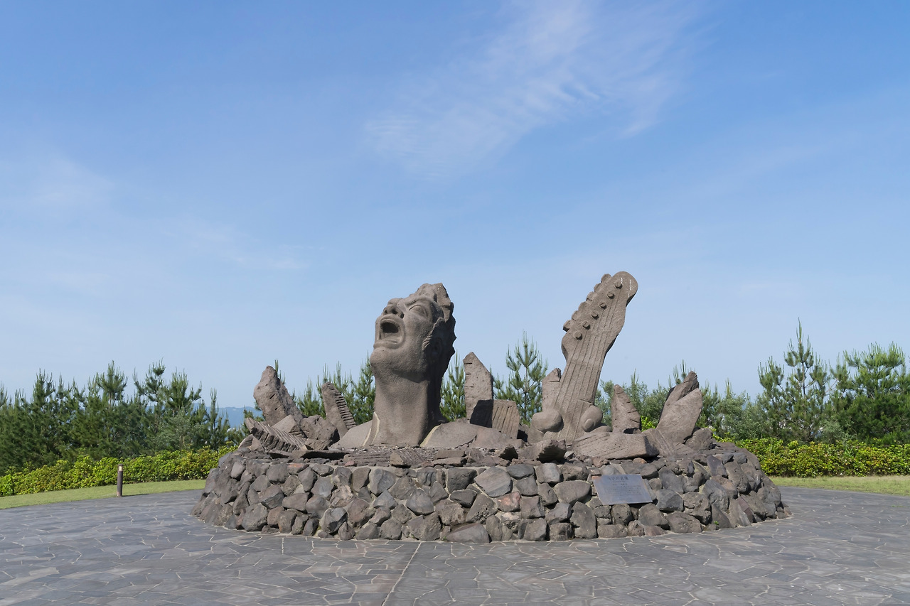 ‘외침의 초상( 叫びの肖像 )’이라는 조각상이 있는 아카미즈 전망 광장. 사쿠라지마 서쪽 해안에 위치한 이 광장은 2004년 8월 21일 나가부치 츠요시( 長渕剛 )라는 일본 유명 가수가 사쿠라지마에서 공연한 것을 기념하기 위해 세워졌다. 당시 이 가수의 콘서트를 보기 위해 7만 5천 명의 관객이 이곳에 모였는데, 사쿠라지마 주민이 6,000명인 것을 감안하면 어마어마한 숫자의 사람들이 모인 것이다. 7만 5천 명의 사람들이 모여 밤부터 새벽까지 '올 나잇 콘서트'를 즐겼는데, 그 당시 공연 사진이 조각상 앞 안내판에 붙어 있다. 사진으로만 봐도 당시 콘서트 열기가 어느 정도 였을지 짐작이 간다.
