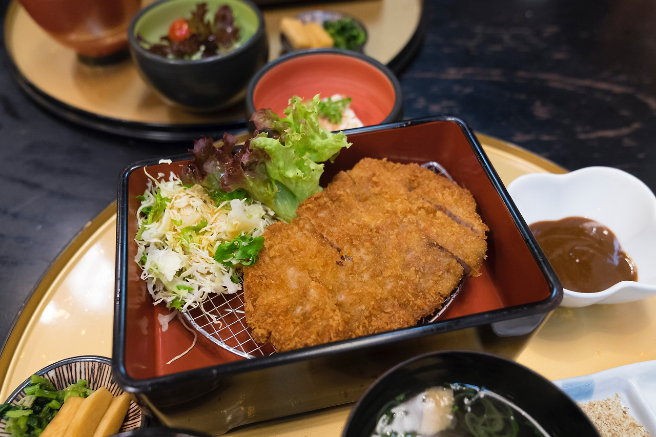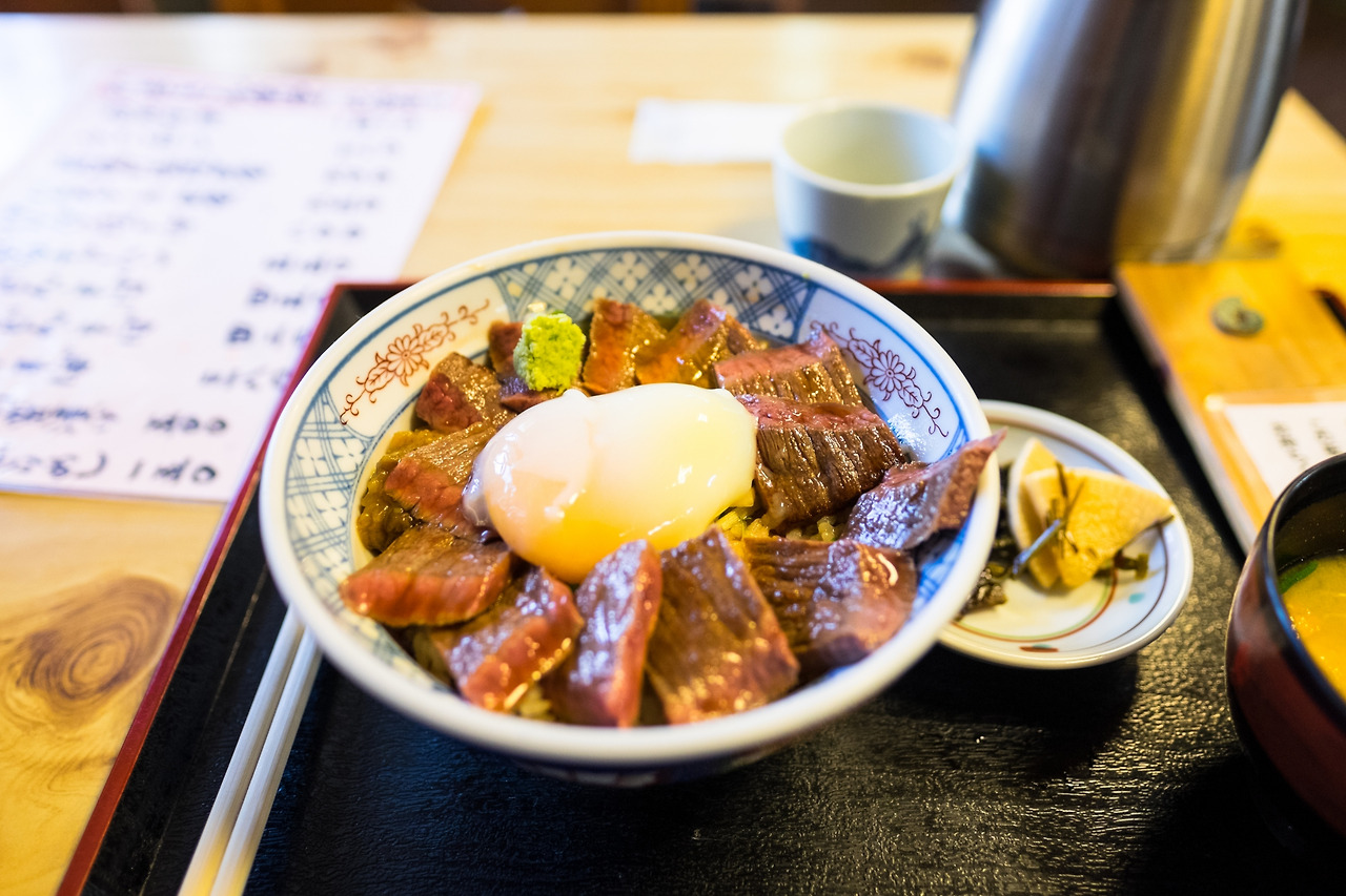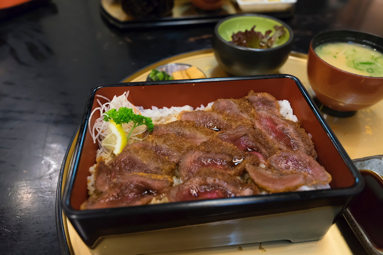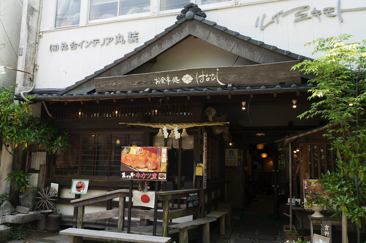 하나비시는 아소 신사 앞 몬젠 마치 거리에 위치한 식당이다. 아소의 대표 소고기인 아카규를 이용한 규카츠 덮밥을 선보인다. 규카츠는 소고기 돈까스라고 생각하면 되는데, 길죽하게 자른 아카규에 빵가루를 살짝 입혀 뜨거운 기름에 살짝 튀겨내는 음식이다. 기름에 살짝만 튀기기 때문에 겉만 바삭하게 익고, 안은 거의 익지 않은 레어 상태다. 이렇게 튀겨진 아카규를 회를 썰 듯이 얇게 잘라 밥 위에 올리면 규카츠 덮밥이 된다.