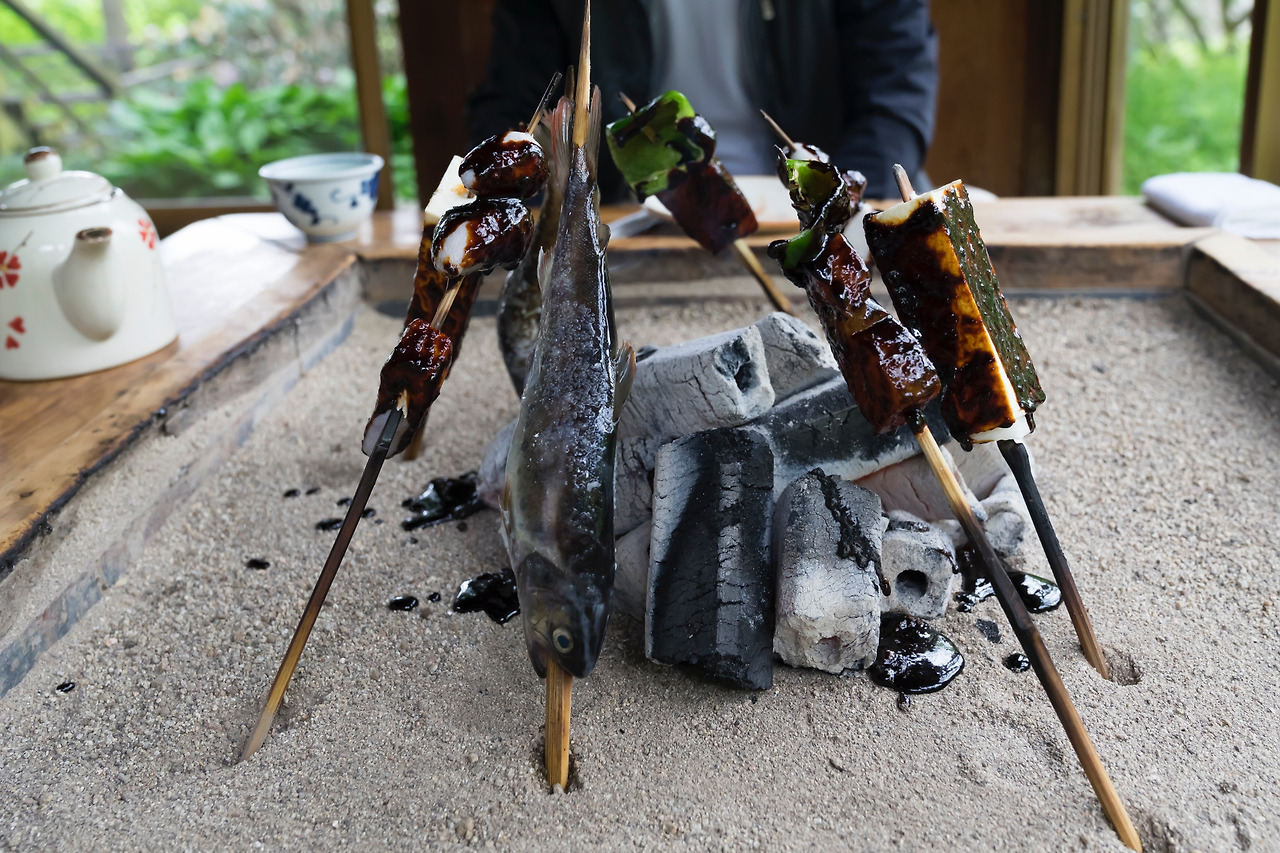 주문 후 뜨겁게 달궈진 숯이 화로 중심에 쌓이고, 3년 이상 숙성시킨 비법 된장을 바른 두부 꼬치가 먼저 꽂힌다. 그 다음 산천어, 곤약 꼬치가 하나둘씩 자리를 잡는다. 산천어는 익는 데 오래 걸리는데, 요령껏 요리 조리 돌려가며 골고루 익혀야 한다. 직원이 계속 오가며 익은 음식은 다 익었다고 말해주므로 걱정하지 않아도 된다. 꼬치구이 외에도 옥수수를 넣은 밥과 된장에 수제비를 푼 단고지루가 함께 제공된다.