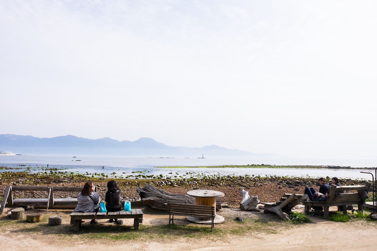 푸딩을 주문하면 유리병에 담긴 푸딩과 함께 돗탄에서 생산한 소금과 캐러멜이 담긴 통이 나온다. 푸딩을 먹을 때는 먼저 소금과 캐러멜을 넣지 않고 푸딩의 본 맛을 맛본다. 그리고 소금과 캐러멜을 살짝 뿌려 먹어 보고, 마지막으로 소금과 캐러멜을 전부 푸딩에 넣어 섞어 먹는다. 푸딩에 소금을 뿌려 먹는 게 낯설긴 하지만, 짭조름하면서도 달달한 맛이 자꾸만 입맛을 당긴다. 공방 앞에는 이토시마 바다를 바라보며 푸딩을 맛볼 수 있도록 나무 의자와 테이블들이 마련되어 있다. 어딘가에서 주워온 것만 같은 제각기 다른 모양의 의자와 테이블이 멋스러운 풍경을 만들고 있다.