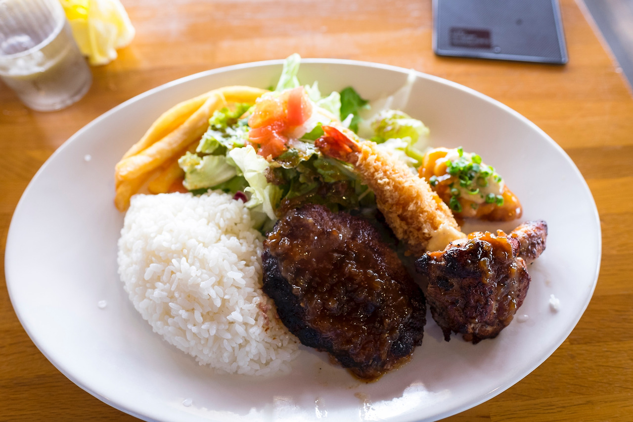 런치, 디너 메뉴가 따로 준비되어 있으며 런치에 손님들이 많다. 가장 인기 있는 메뉴는 믹스 함바그 플레이트 (ミックスハンバーグプレート, 1,500엔)로 함바그와 닭튀김, 새우튀김, 감자튀김, 샐러드, 밥이 한 접시에 담겨 나온다. 엄지를 척 들게 만들 만한 맛에 양까지 푸짐해 먹고 나면 빵빵하게 배가 부풀어 오른다. 데미글라스 소스를 얹은 오믈렛도 인기가 좋다. 저녁에는 보다 더 다양한 이탈리안 요리들이 준비된다. 스파게티를 비롯해 그라탕, 리조또 등 다양한 음식을 맛볼 수 있다. 메뉴판에 음식 사진이 다 나와 있어 일본어를 몰라도 주문에 어려움이 없다.
