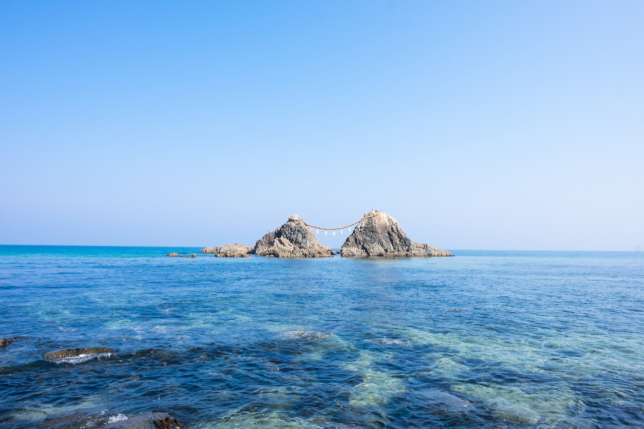 이토시마 드라이브의 하이라이트라고 할 수 있는 사쿠라이 후타미가우라. 이토시마의 마스코트와 같은 암초로 마치 부부처럼 사이좋게 붙어 있다고 해서 일명 '큰 부부 바위'로 불린다. 오른쪽 암초가 왼쪽 암초보다 살짝 더 큰데 오른쪽 암초를 남편 바위(11.8m), 왼편의 암초를 아내 바위(11.2m)라고 부른다.