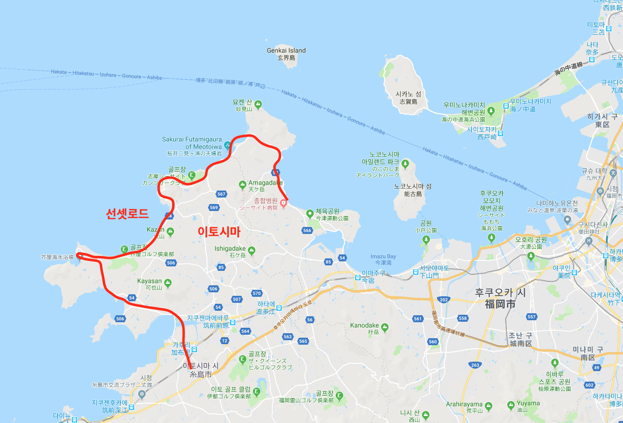 후쿠오카 시내에 사는 사람들은 이토시마를 드라이브 코스로 즐긴다. 자동차를 타고 이토시마 반도(糸島半島) 해안 도로인 선셋로드를 돌아보는데, 33.3km에 달하는 선셋로드에는 이국적인 분위기의 카페, 레스토랑이 곳곳에 자리 잡고 있다. 또한 선셋로드 중간 지점에는 이토시마의 마스코트와 같은 사쿠라이 후타미가우라가 있다. 부부 바위로 불리는 사쿠라이 후타미가우라는 이토시마의 명소로 부부 바위 앞 해변을 한가로이 산책하는 사람들을 많이 볼 수 있다. 번잡한 후쿠오카 시내를 벗어나 이토시마 선셋로드를 따라 드라이브를 즐기며 분위기 좋은 카페와 레스토랑에서 커피와 음식을 맛보며 한가로이 여유를 부려보자.